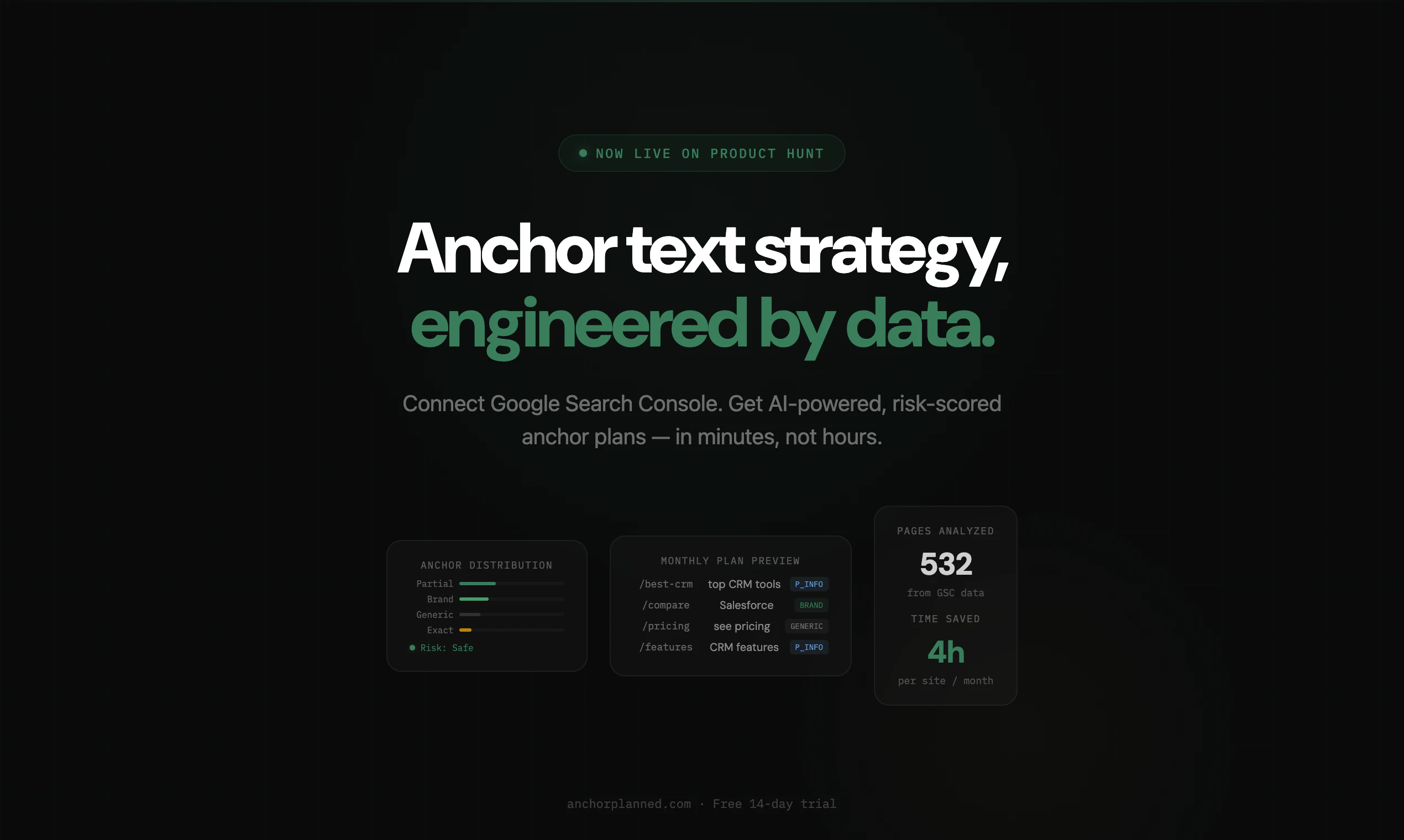 "Hey Product Hunt 👋Founder here.I've been doing SEO for 8+ years already, so link building has been a core part of my work for a really long time too. Planning anchor text across client sites eventually became second nature: which URLs get links, which anchors fit where, how to balance brand / exact / partial / generic against the profile you already have, and how to avoid over-optimization patterns.After doing this at scale for enough sites, something became obvious: the decisions were systematizable. Experienced link builders aren't improvising — they're running a mental pipeline. Mine just happened to be running inside a spreadsheet.So I rebuilt the pipeline in code.AnchorPlanned is the result. What used to be 3–5 hours per site per month is now ~10 minutes.What it does:Connects to your Google Search Console — pulls real query data, no manual keyword inputRuns a 7-stage deterministic engine: maturity scoring → brand tokens → URL classification → placement allocation → anchor assignment → text generation → safety validationOutputs a month-by-month plan with specific anchors, balanced across 6 anchor classes and 3 strategy modes (Safe / Moderate / Aggressive)Exports to Google Sheets so your team can execute without touching the appWhat it's not:Not an "AI-powered anchor generator" that invents commercial terms. Engine is deterministic — same input → same output. 165 automated tests on the pipeline.Not an all-in-one SEO suite. Single-purpose on purpose.Not for beginners. It assumes you know what a partial commercial anchor is and why the ratio matters.The build:Vibe-coded with Claude + Cursor. ~40 hours over 3 weeks. Zero lines written by hand. Currently in use by link building agencies and multi-site SEO consultants in private beta.If you plan anchors (or your agency does), I'd love for you to break it. I'm in the comments all day.Especially curious about:How you currently handle anchor planningEdge cases you think would break the engineWhat you'd want shipped nextUpvote if it resonates — and tear it apart in the comments. That's where the real feedback lives."
