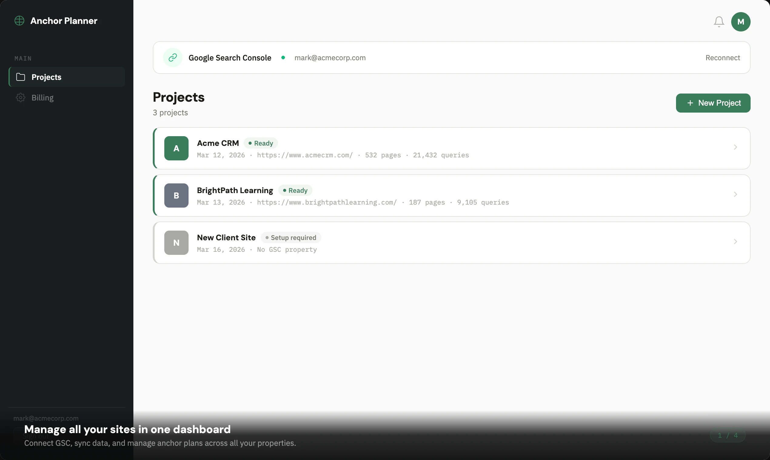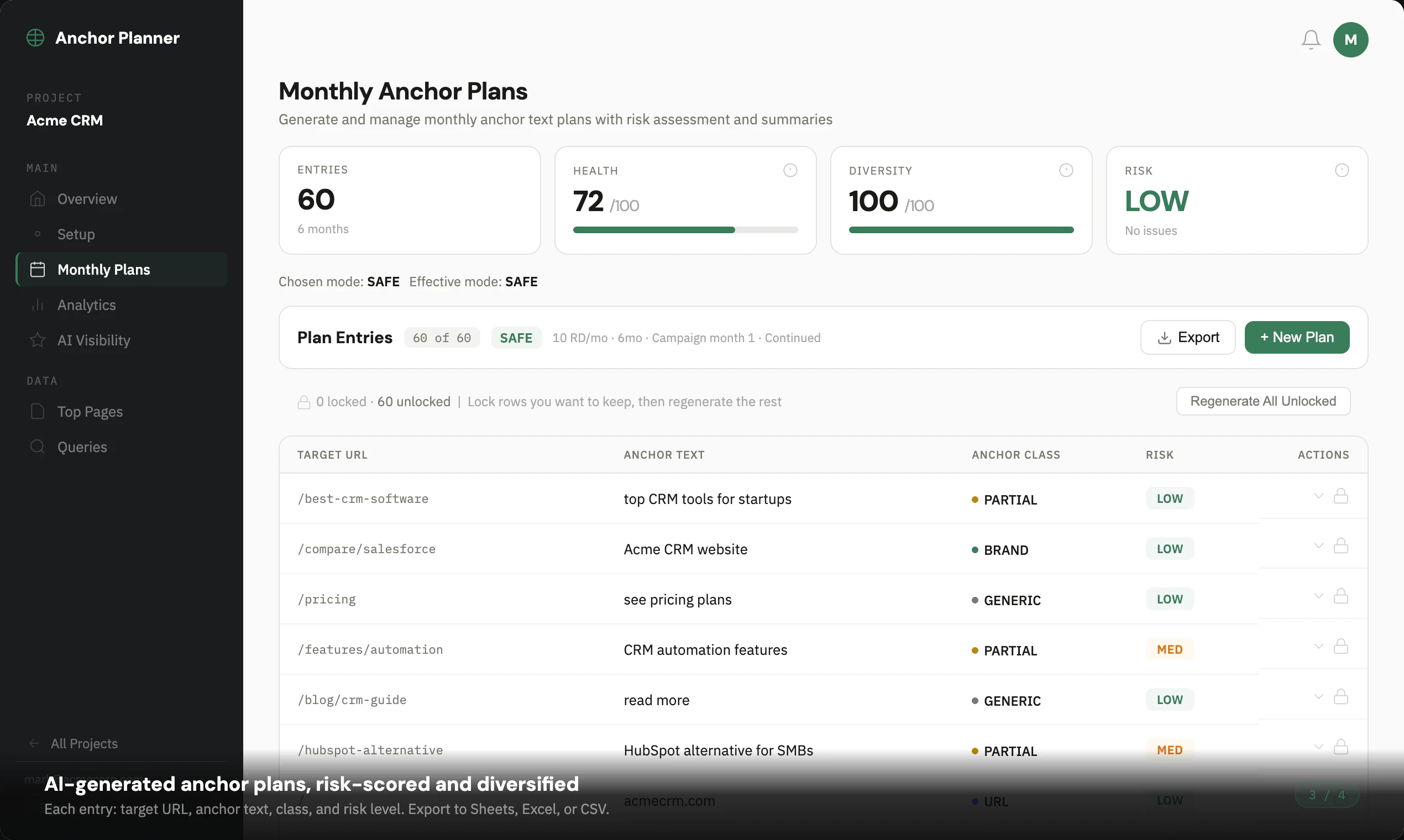 Anchor text planning is the spreadsheet ritual every link builder secretly hates. 3-5 hours per site, every month, guessing ratios and praying nothing breaks. AnchorPlanned kills that. Connect your GSC — in about 10 minutes you get a month-by-month anchor plan where every entry is risk-scored, and every page is classified by intent—all from your real search data, not third-party estimates. From $9/mo. Free trial — try it before you pay a cent.