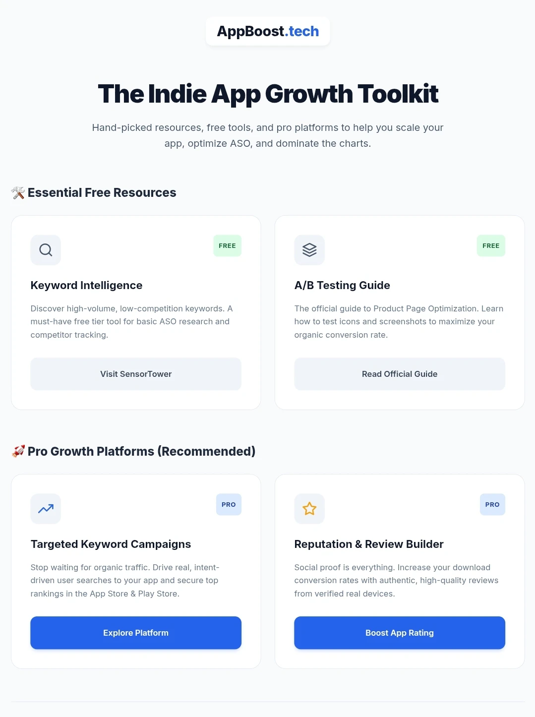 Stop guessing with ASO. AppBoost Toolkit is a hand-picked directory combining essential free research tools with pro-level platforms to help indie developers drive targeted installs and dominate the charts.