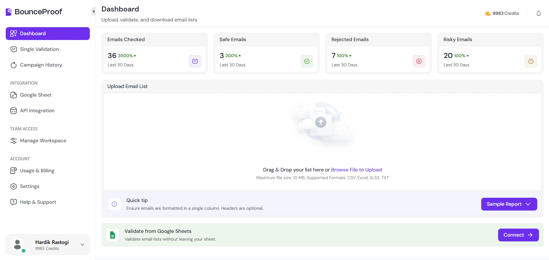 "I’m Hardik, and I built BounceProof to solve a personal frustration: losing sender reputation to "dirty" email lists. We wanted a tool that was both powerful and met you where you already work. What’s under the hood? Precision Validation: Strip out disposables, syntax errors, and "catch-all" emails. G-Sheets Add-on: Clean your leads directly in your spreadsheet—no more CSV exports. Pro Dashboard: Bulk upload and get deep insights into your list health. We’re live and ready for your feedback. I’ll be here all day to answer questions! What’s one feature you wish your current email validator had?"