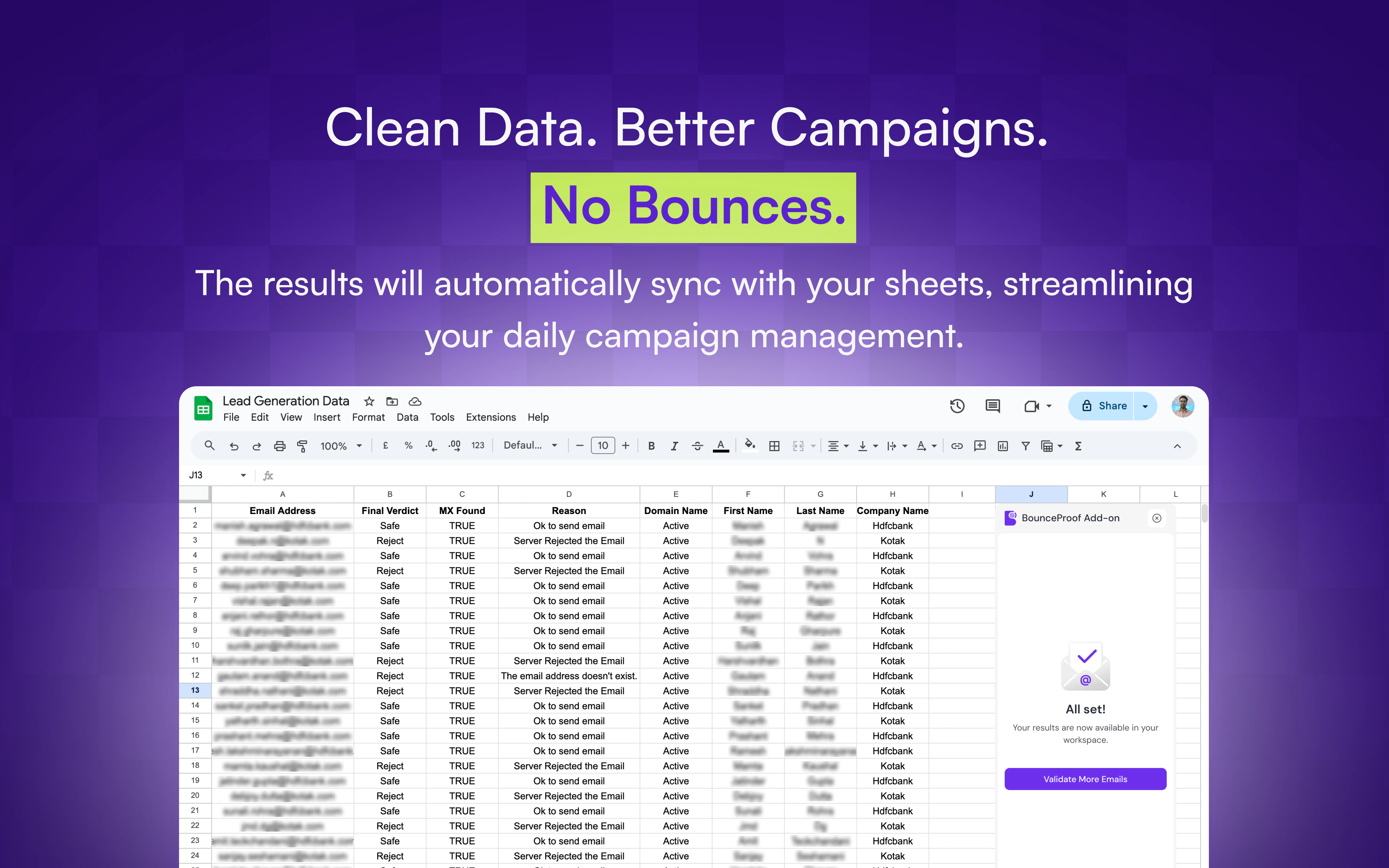 BounceProof is a simple email validation tool that cleans your lists and removes disposables to stop bounces. Protect your sender reputation and boost deliverability using our powerful dashboard or our seamless Google Sheets add-on. Clean your data right where it lives.