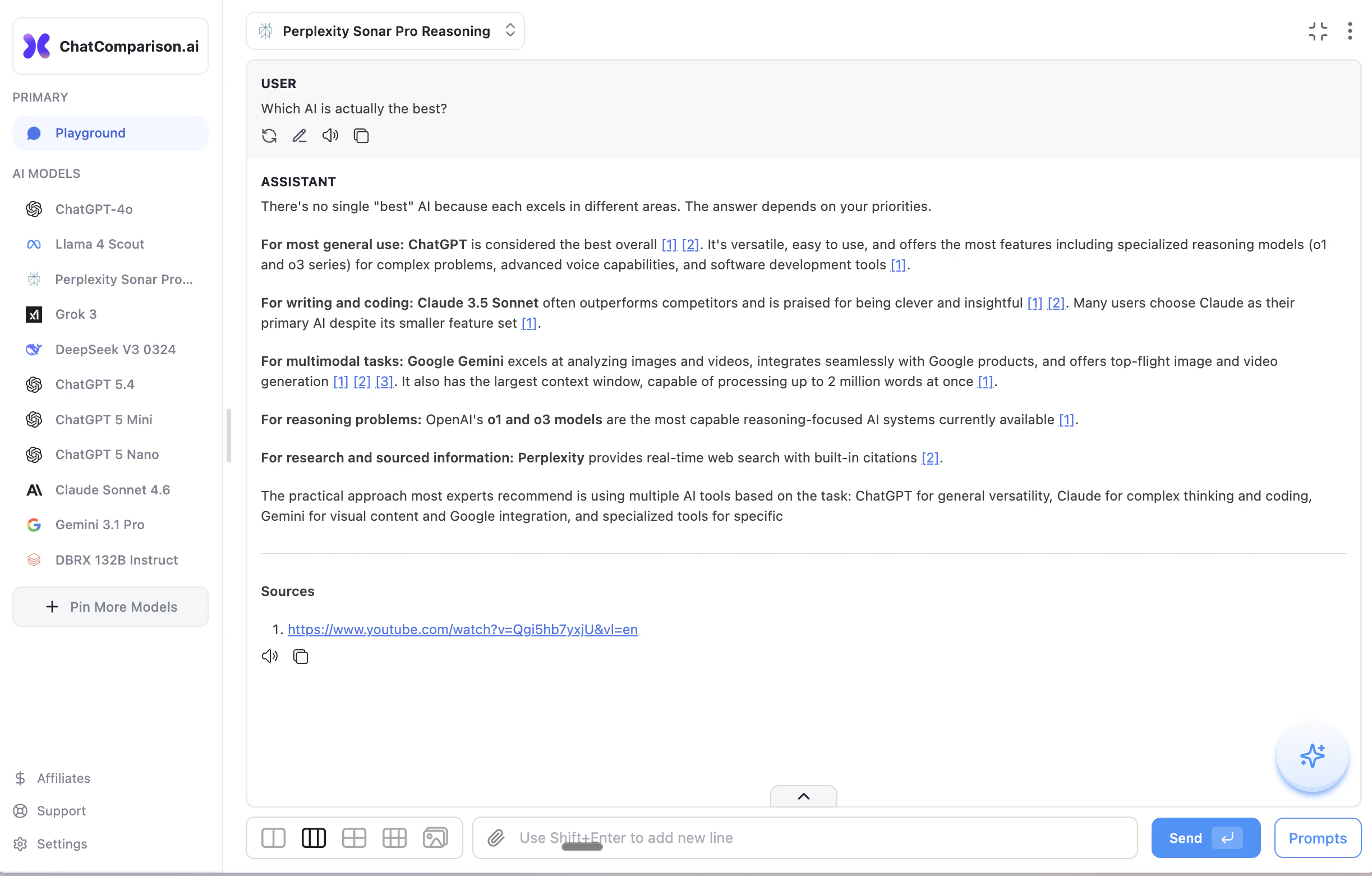 "Hey everyone š I built ChatComparison because I kept switching between AI tools trying to figure out which one actually gives the best answer. Copying the same prompt into ChatGPT, Claude, etc. got repetitive fast. So I made something simple: You write one prompt ā see results from 40+ models instantly. What surprised me most is how different the answers can be depending on the task. This is still early, and Iām improving it every week ā Iād really appreciate any feedback or ideas on what to improve š"