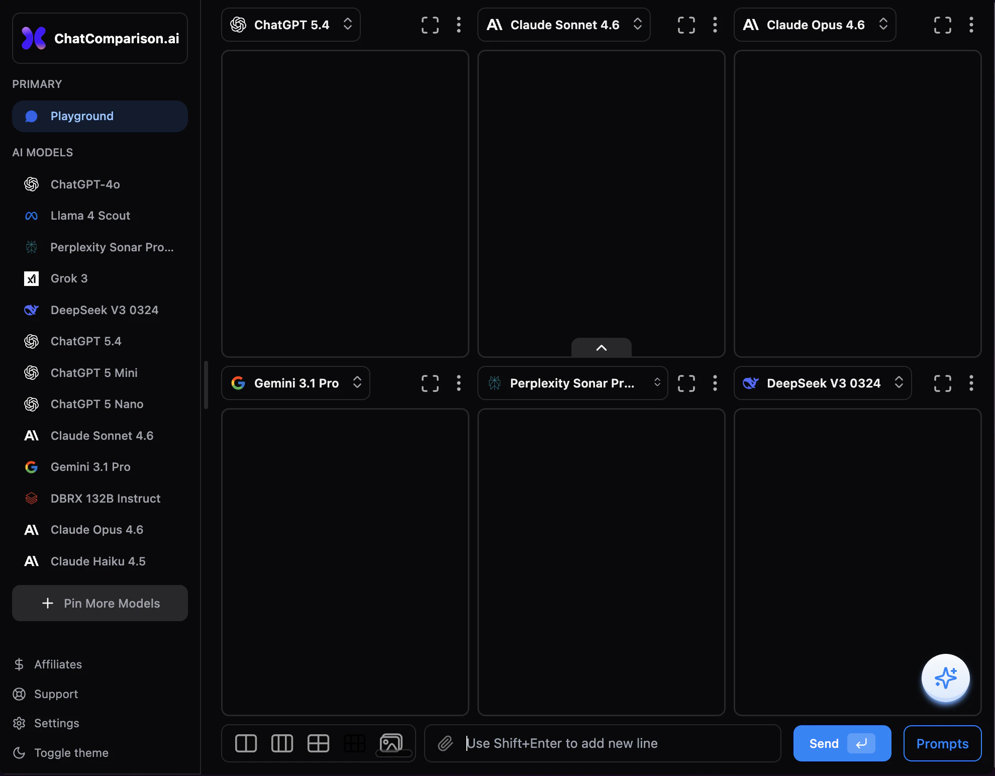 Stop guessing which AI is best ā test them side-by-side in seconds Latest Models From GPT, Claude, Etc... Price drop $20/Month for 40+ different Models. Dark Mode Added For Users LifeTime Deal Available