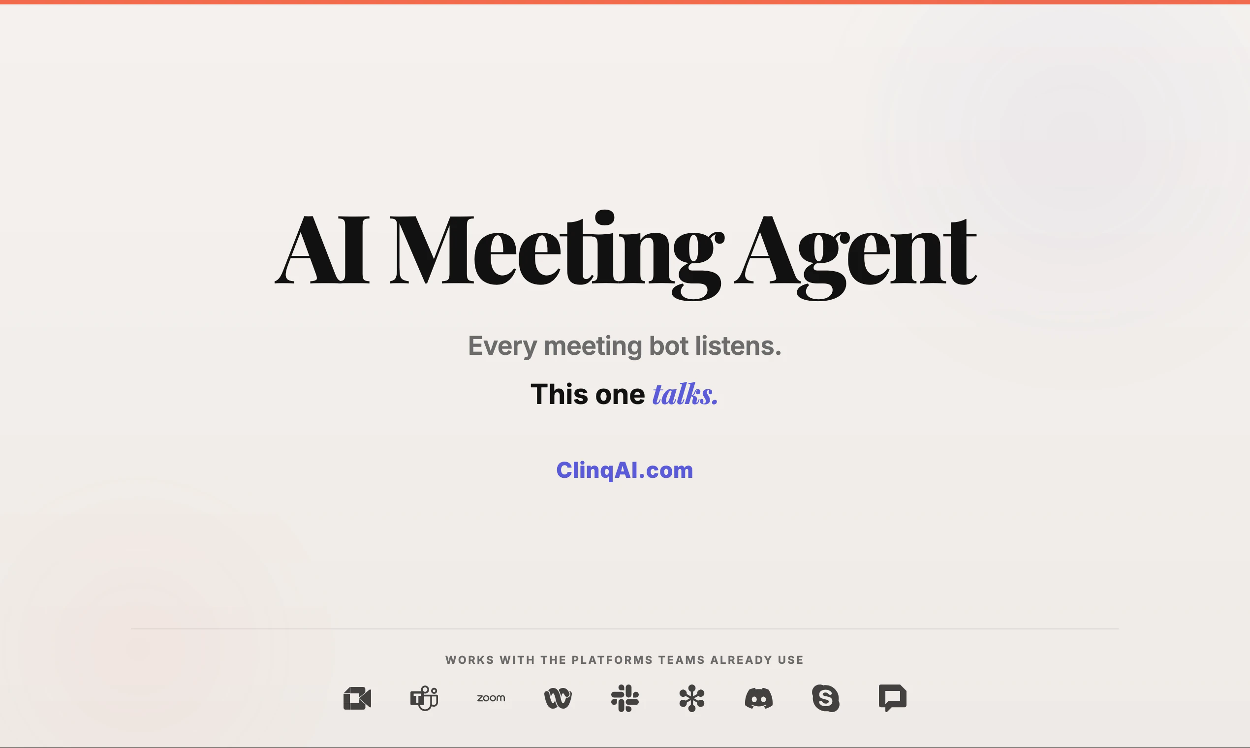 You already have a bot on your calls. It joins, records, transcribes, and writes a summary nobody reads. What if it could talk back? Clinq is the first meeting bot that actually speaks. It joins your Google Meet, greets the person on the other side, and runs the entire conversation - out loud, autonomously, no human on the call. How it works: Paste your Google Meet link ==> Tell Clinq what to do - who it's talking to, what the goal is ==> Clinq joins in 5 seconds and starts talking