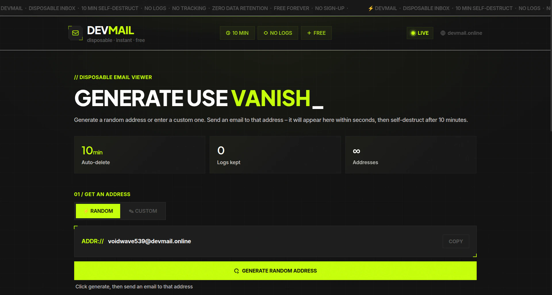 DEVMAIL : Create disposable temporary email addresses that self-destruct after 10 minutes. No registration, no tracking, no logs. Perfect for avoiding spam.