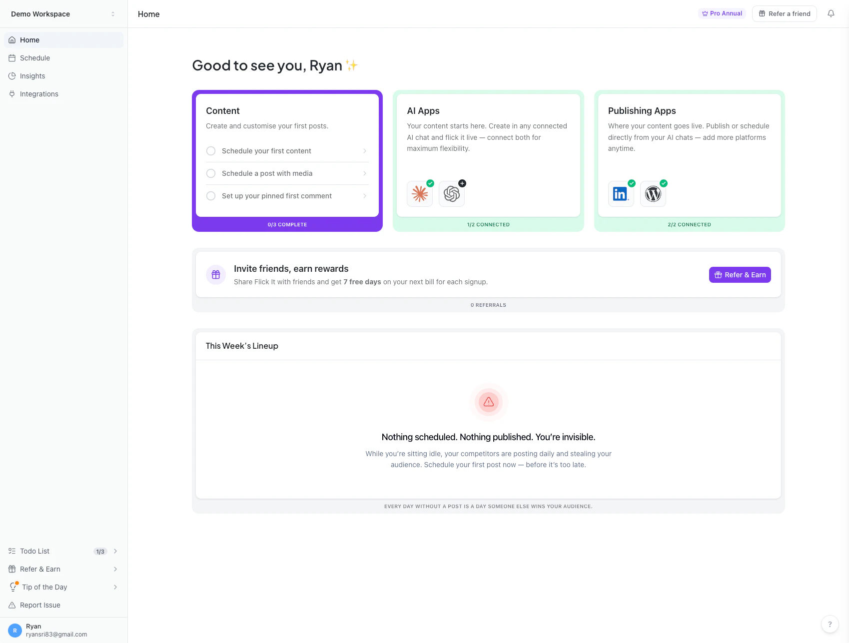 "Hey Product Hunt! I'm Ryan, the maker of Flick It. Like most of you, I use ChatGPT and Claude every day to create content. The AI part is great. But what happens after? That is where things get annoying. ➜ Copy the output. ➜ Open WordPress. ➜ Paste. Format. Publish. ➜ Switch to another tab. ➜ Open LinkedIn. ➜ Paste again. Reformat. Schedule. ➜ Do the same thing tomorrow. ➜ And the day after. I was spending more time copy-pasting and switching between tabs than actually creating anything. AI solved the hard part, which is writing. But nobody solved the boring part, which is getting it published everywhere. So I built Flick It. Create your content in whatever AI tool you like. Then just Flick It. Your content gets scheduled directly to WordPress and LinkedIn. No copy-pasting. No switching tabs. No logging into each platform one by one. Just Flick It and it is scheduled. Here is where we are right now: 👉 Works with ChatGPT and Claude 👉 Publishes to WordPress and LinkedIn 👉 More AI tools and platforms coming soon 👉 Free to start I would love to hear what you think. And one question for this community: which platform should we add next? Drop it in the comments. Your vote will literally shape our roadmap."