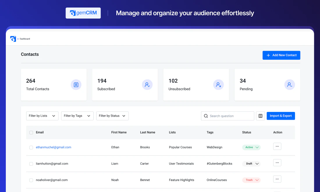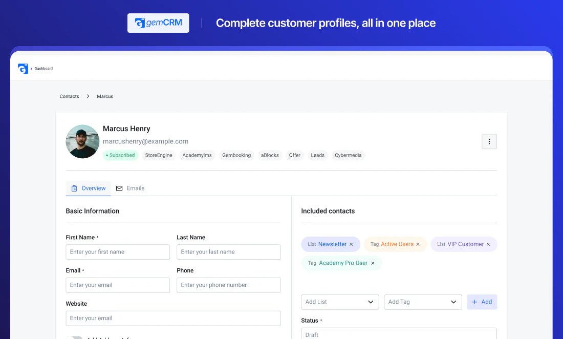 GemCRM is a WordPress-native CRM that helps you capture leads, manage contacts, and run targeted email campaigns without leaving your dashboard. Automatically collect leads from comments, segment with lists & tags, and launch recurring campaigns with a clean, simple interface built for WordPress users. 🚀