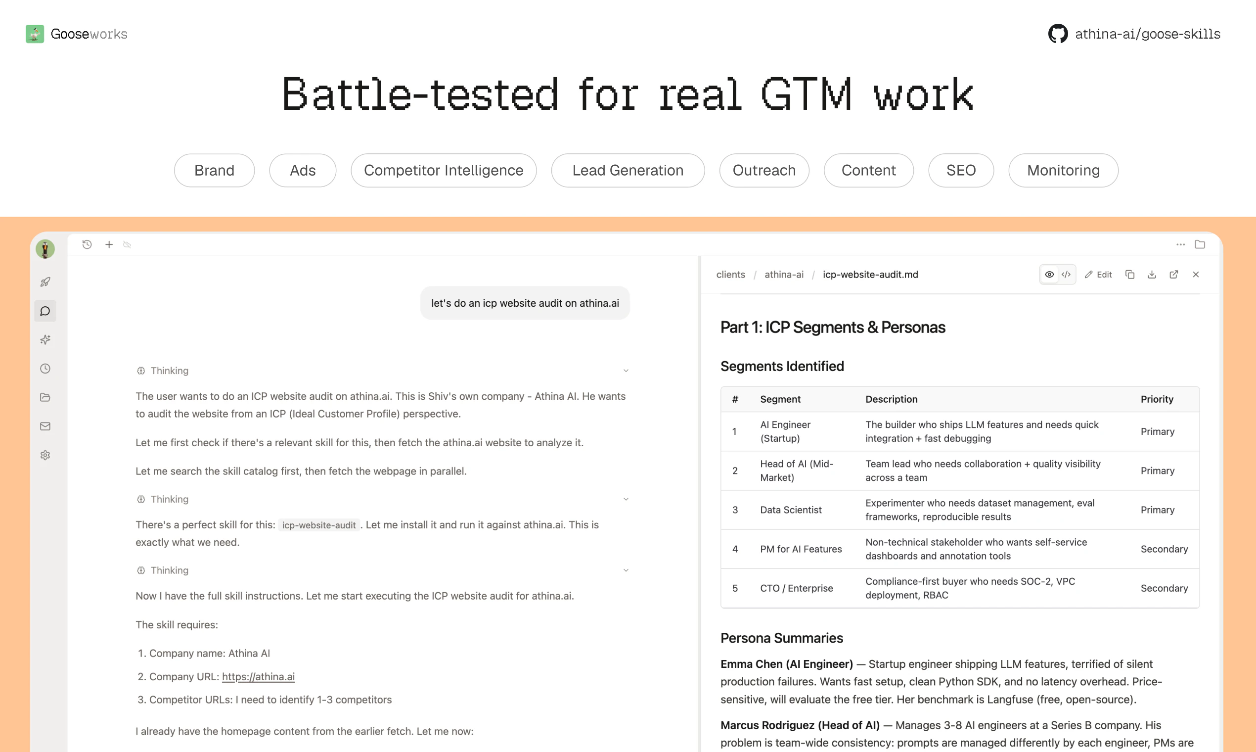 "Hi Product Hunt 👋I’m Himanshu, co-founder of Gooseworks (YC W23).My co-founder @shivsak and I have been using Claude Code for most of our GTM – from lead gen to content to competitor research and even our SEO audits. It’s insanely powerful. But we kept hitting one problem: Every session, we had to re-explain our workflows from scratch.“Here’s how we find leads…”“Here’s our SEO checklist…”“Here’s how we manage ads…”So we started turning these workflows into Skills. Over time, we built 100+ of these for GTM… so we open-sourced the whole library.Two ways to use them:1. With Claude Code (OSS): Clone the repo, drop skills into `.claude/skills/`, done.2. With Goose (zero setup): Use our OpenClaw-style AI agent Goose – all skills are pre-installed.Everything is free and open-source on GitHub. Would love your feedback on which workflows are most useful – and what GTM workflows you'd want us to add next.→ Browse: https://skills.gooseworks.ai→ GitHub: https://github.com/athina-ai/goose-skills"