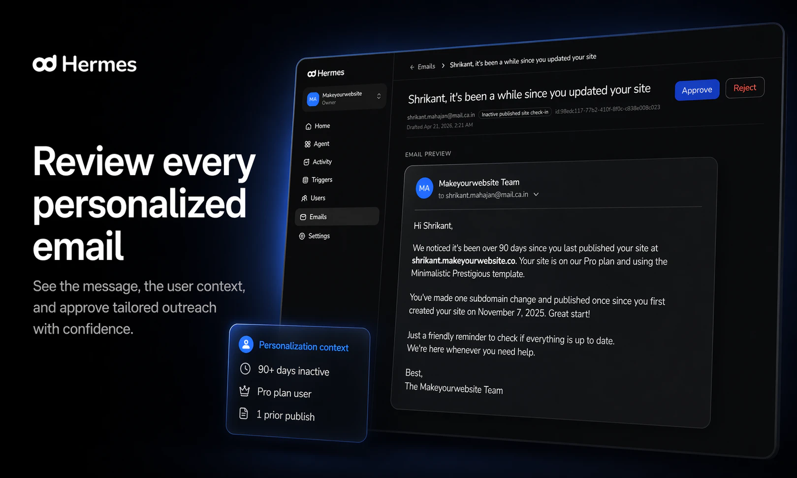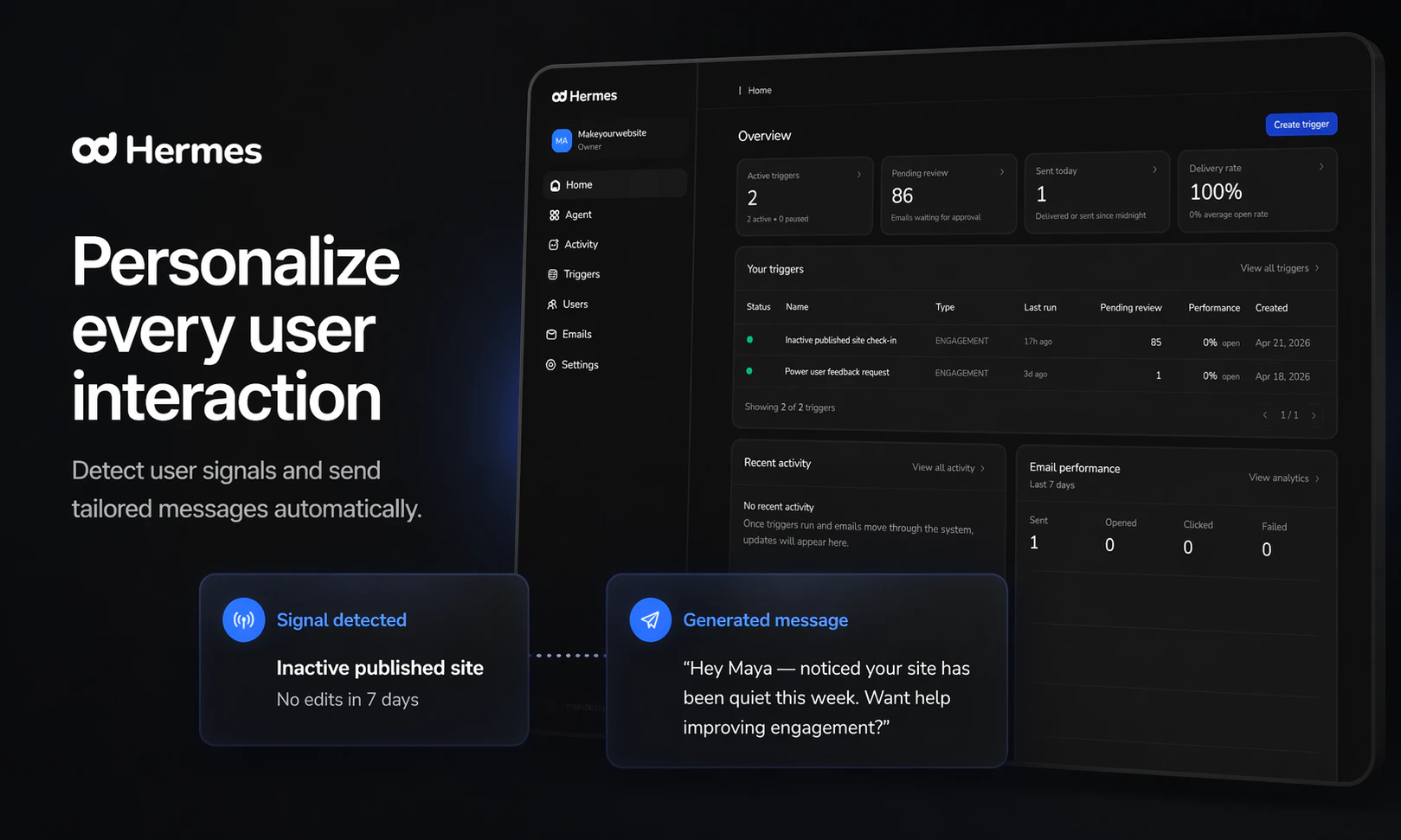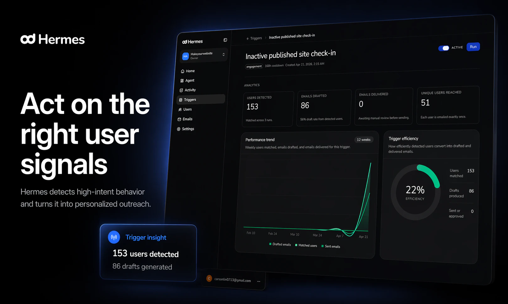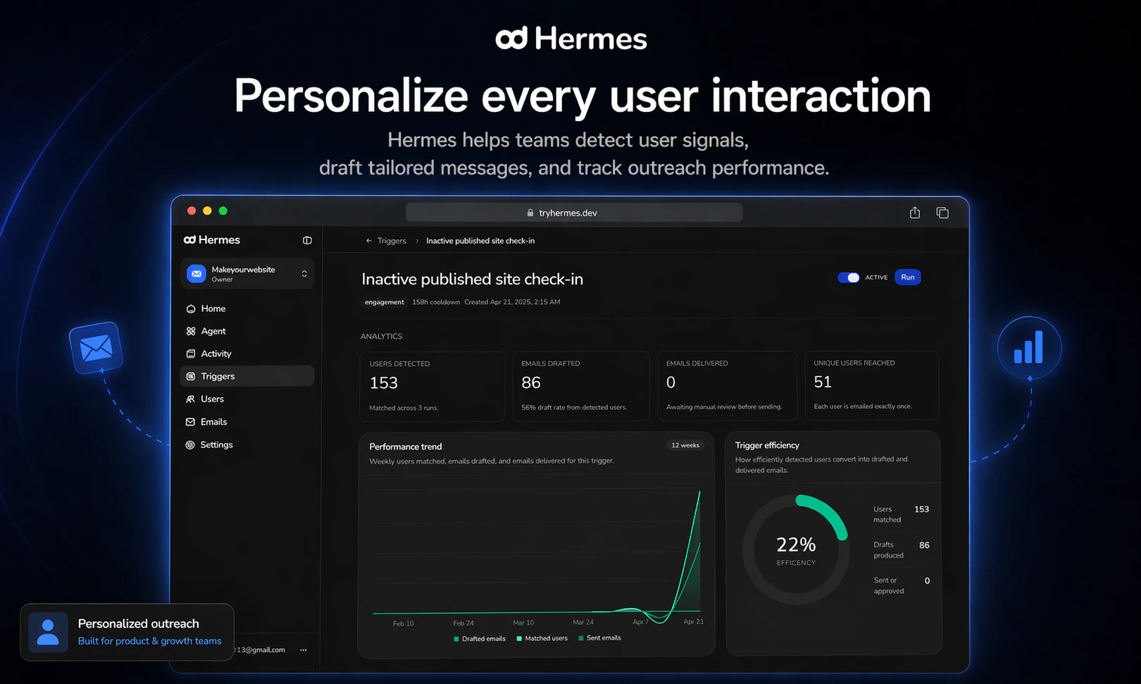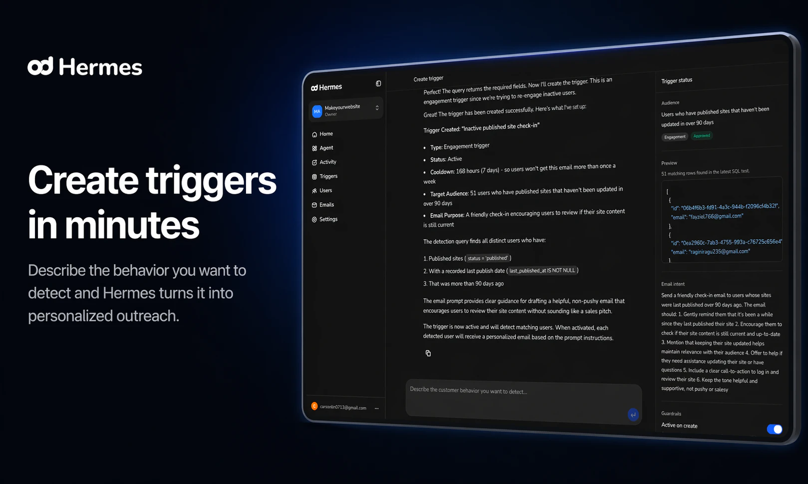 "Hey Product Hunt! 👋 Users don’t churn randomly, they leave with signals sitting in your database. We saw it happen over and over while building our own SaaS products: a user activates, does something meaningful… then disappears. The “why” was always in the data, we just weren’t acting on it. So we tried something simple: manually writing a personal email to each user based on what they actually did. It worked. Every time. It just didn’t scale. So we built Hermes. Here’s the difference: Loops, Customer.io, Braze → Require heavy setup. You push data in, define segments, send the same template to everyone. Monaco → Helps you win new customers. Hermes → Connect your Postgres (read-only), and instantly send a unique, behavior-aware email to every single user — at the exact moment it matters. No segments. No templates. Just messages that actually understand the user. We launched a week ago: → 7 B2B customers → zero outbound → zero churn And the biggest signal so far: founders are already referring other founders to us — including YC teams — which has been our only growth channel. If you’ve ever watched users disappear and wished you could act on it instantly, we built this for you. We’re onboarding new teams this week for free — would love your feedback 🙏 👉 tryhermes.dev"