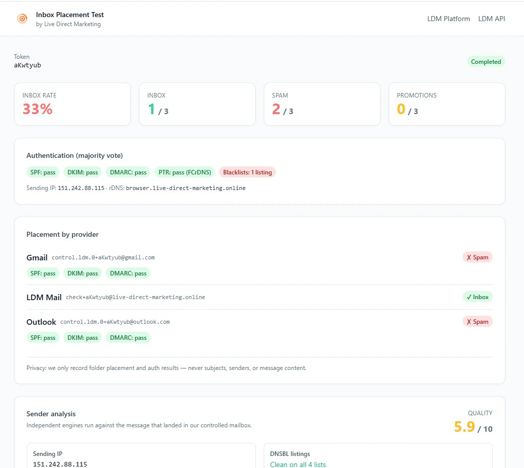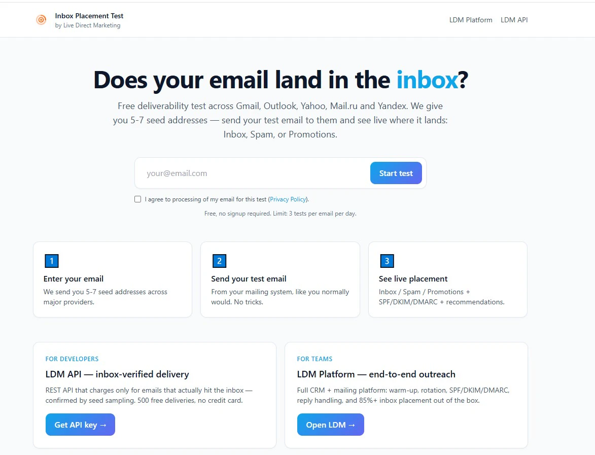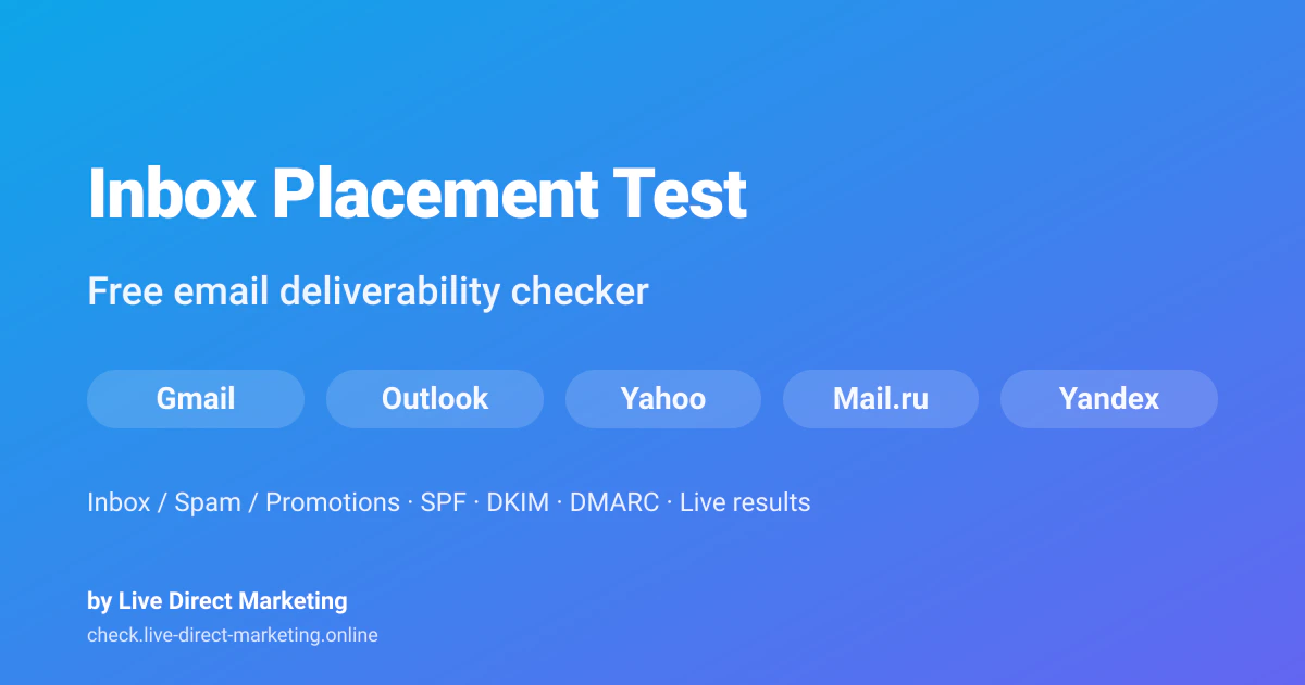 Most email tools confirm SMTP delivery but never tell you if your message hit Inbox, Spam, or Promotions. Enter your email, get 5-7 seed addresses across Gmail, Outlook, Yahoo, Mail.ru and Yandex. Send your test email. See live placement results plus SPF, DKIM and DMARC check with actionable tips. No signup. No credit card. Results in under 2 minutes. Built by a B2B cold outreach practitioner with 5+ years in email deliverability.