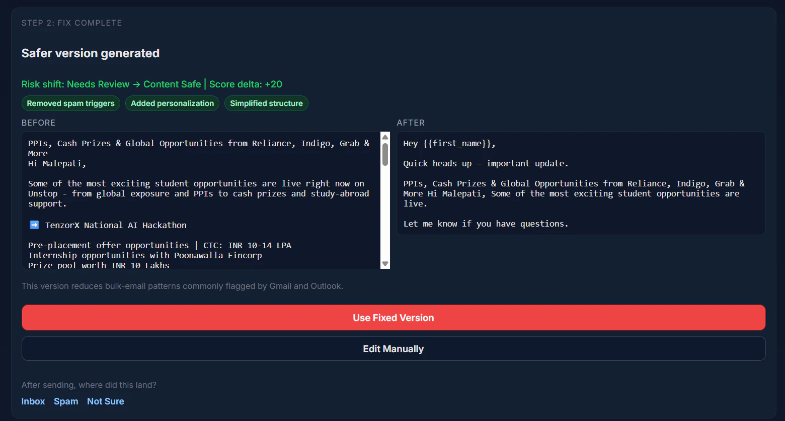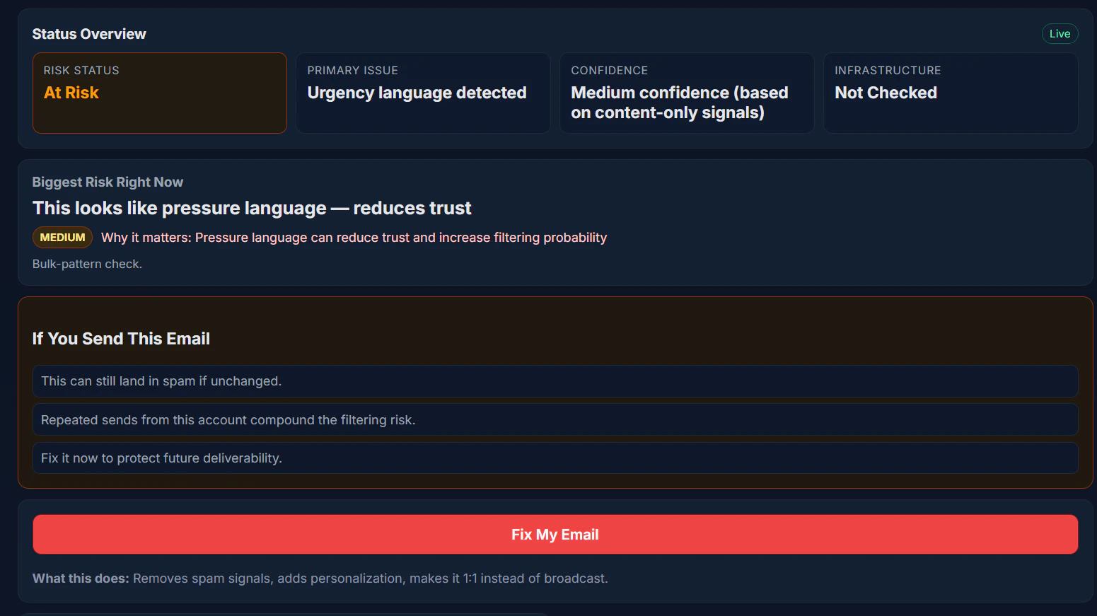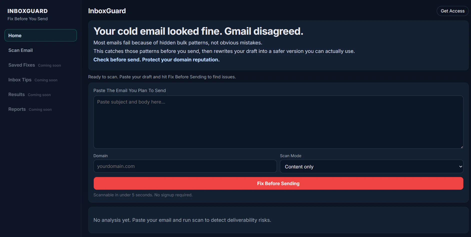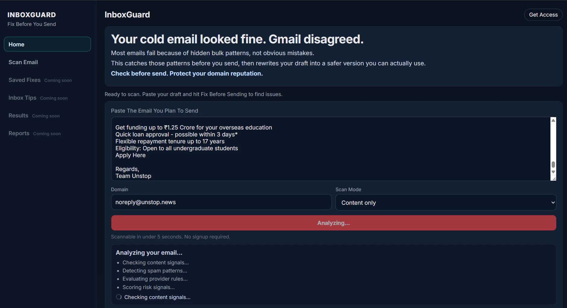 "Built this after realizing most “bad campaigns” were actually deliverability issues, not copy. I was sending emails that looked fine but were silently going to spam because of things like SPF misalignment, too many links, or subtle content signals. InboxGuard checks your email before you send and tells you what might hurt your inbox placement, along with fixes. Curious how you currently test deliverability before sending. Or do you rely on post-send metrics?"