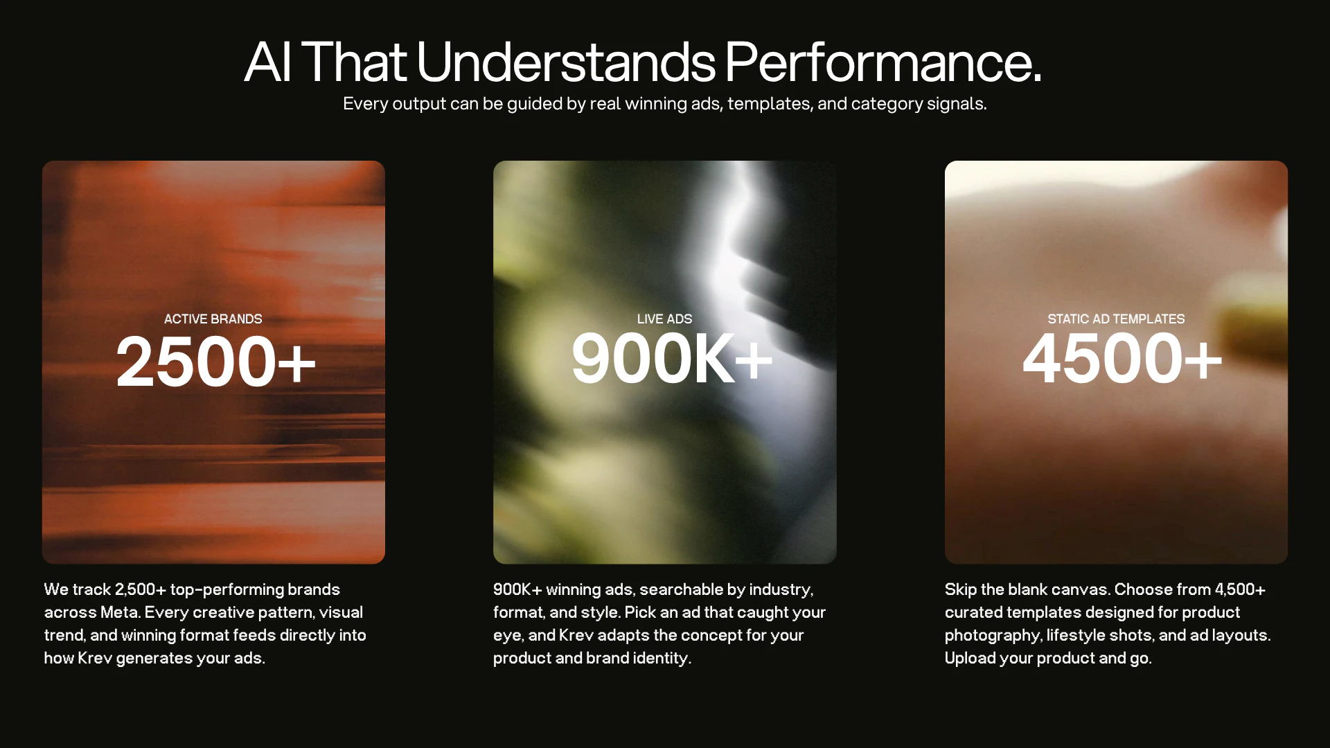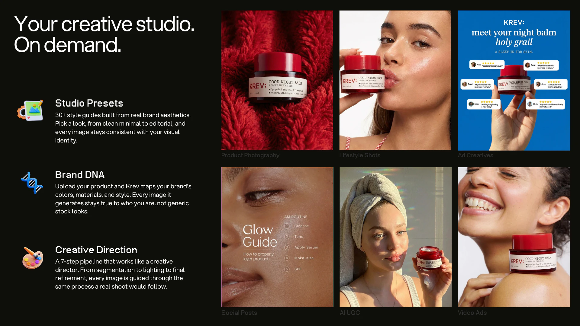 KREV helps ecommerce brands turn a single product image into product photos, video ads, and launch-ready creative. Unlike generic AI tools, KREV is guided by real ad signals, proven creative patterns, and tracked brand data to generate assets that feel more intentional, on-brand, and performance-ready.