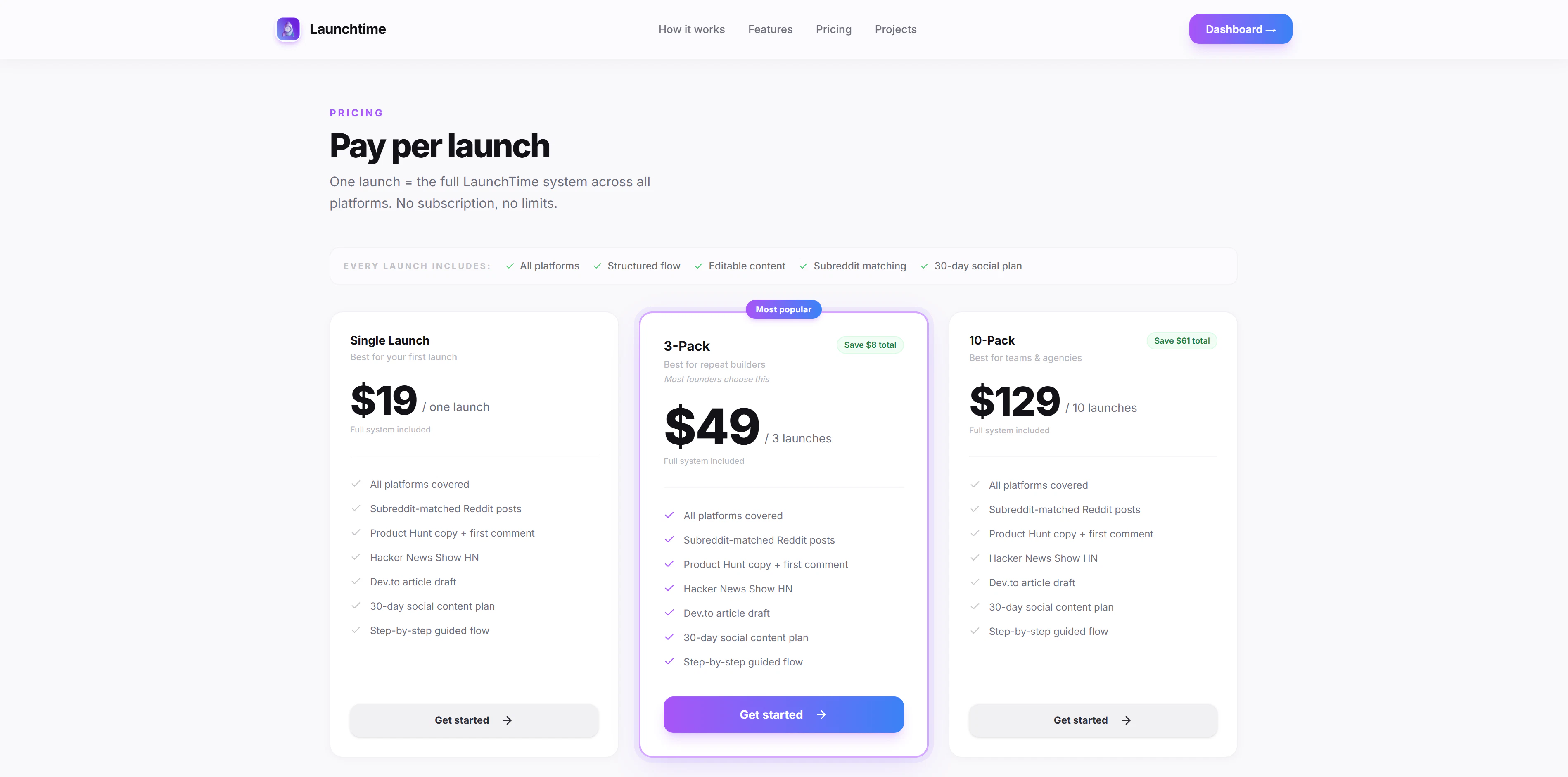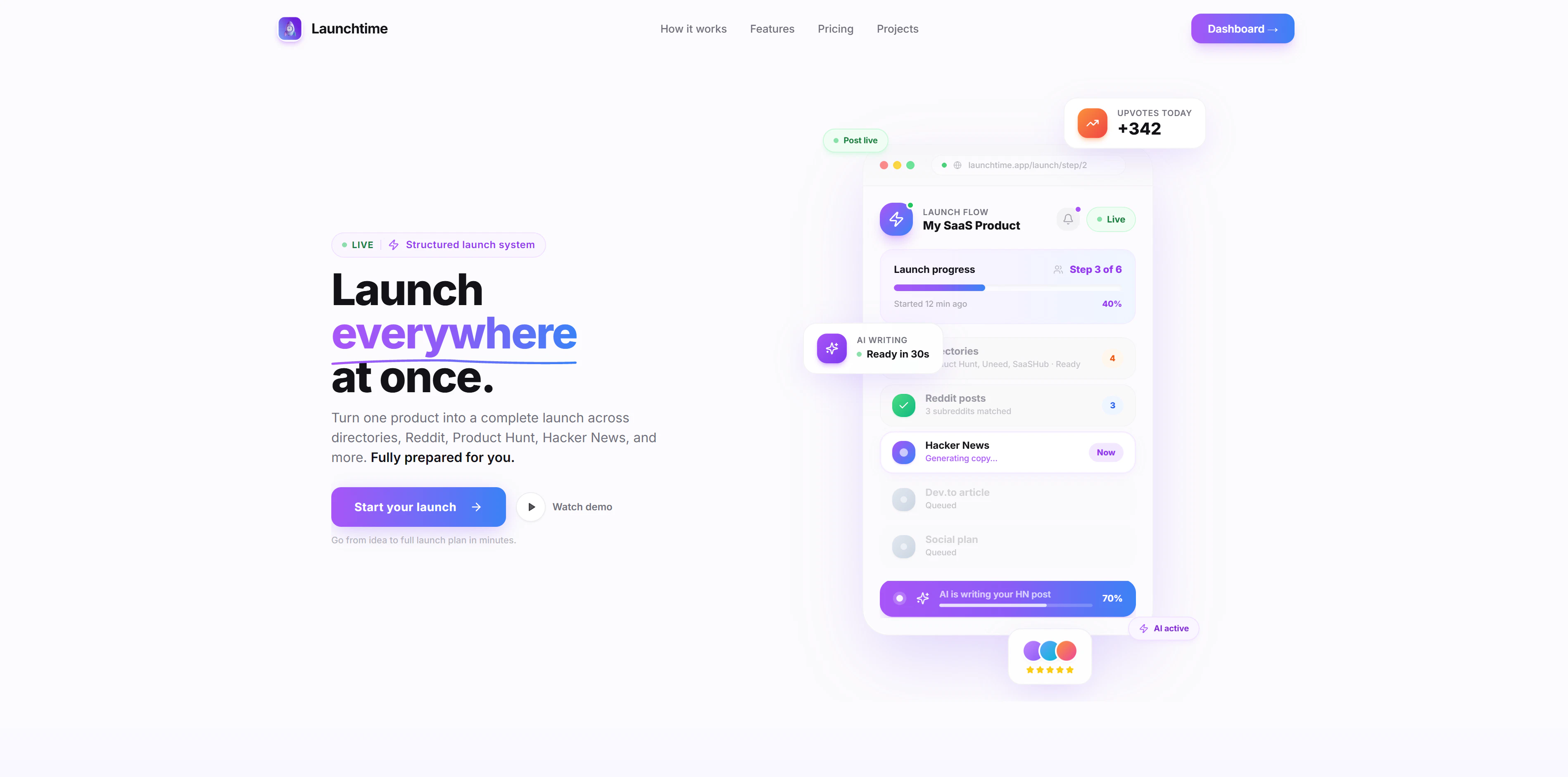 Launchtime generates platform-specific launch content for Product Hunt, Reddit, Hacker News, Dev.to, and directories. Step-by-step guided launch system for founders and indie hackers.
