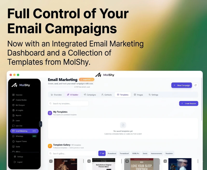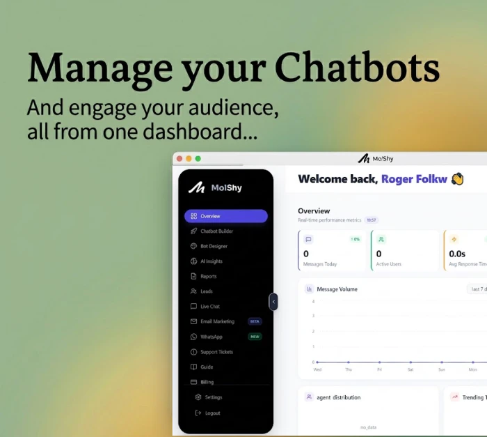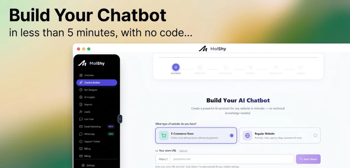 "Hey Product Hunt! š I'm the maker behind MolShy, and I'm excited to share what I've been building. The problem is simple: small businesses and e-commerce stores need AI chatbots and email marketing, but the existing tools are either too expensive, too complex, or force you to juggle multiple platforms. MolShy solves this by combining everything into one dashboard: ā Build an AI chatbot trained on YOUR data in under 5 minutes ā Design it to match your brand with our visual Bot Designer ā Run email campaigns with 100+ templates and a drag-and-drop Design Studio ā Track everything with real-time analytics and AI insights No code required. No technical knowledge needed. I built this because I saw e-commerce store owners struggling with expensive chatbot solutions that didn't even match their brand, and then having to pay for a completely separate email marketing tool on top of that. MolShy starts with a free trial (300 messages, no credit card) so you can test everything before committing. I'd love to hear your feedback ā what features matter most to you? What would you improve? Every comment helps me build a better product. š Try it at: https://app.mychatbot.space/login"