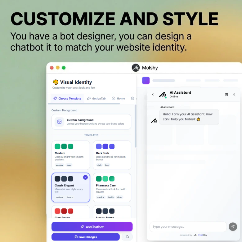 MolShy combines an AI chatbot builder and email marketing in one dashboard ā no code needed. Paste your URL, and MolShy auto-detects your products and data to create a trained chatbot in under 5 minutes. Customize its look with our Bot Designer to match your brand perfectly. Need email marketing too? Use 100+ templates and a drag-and-drop Design Studio ā built in, not a separate tool. Track everything with real-time analytics. Works with Shopify, WooCommerce, Wix, WordPress, and any website.