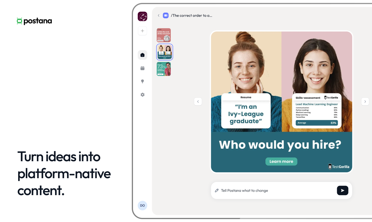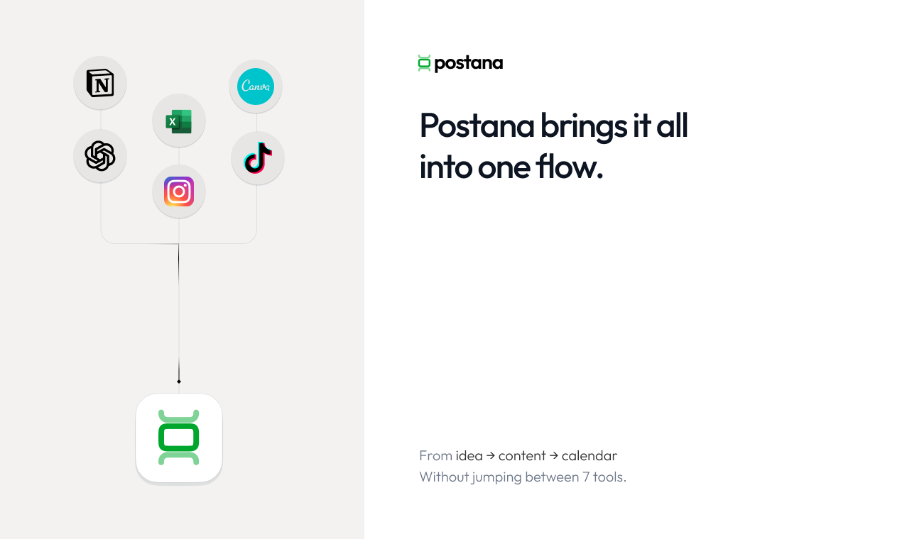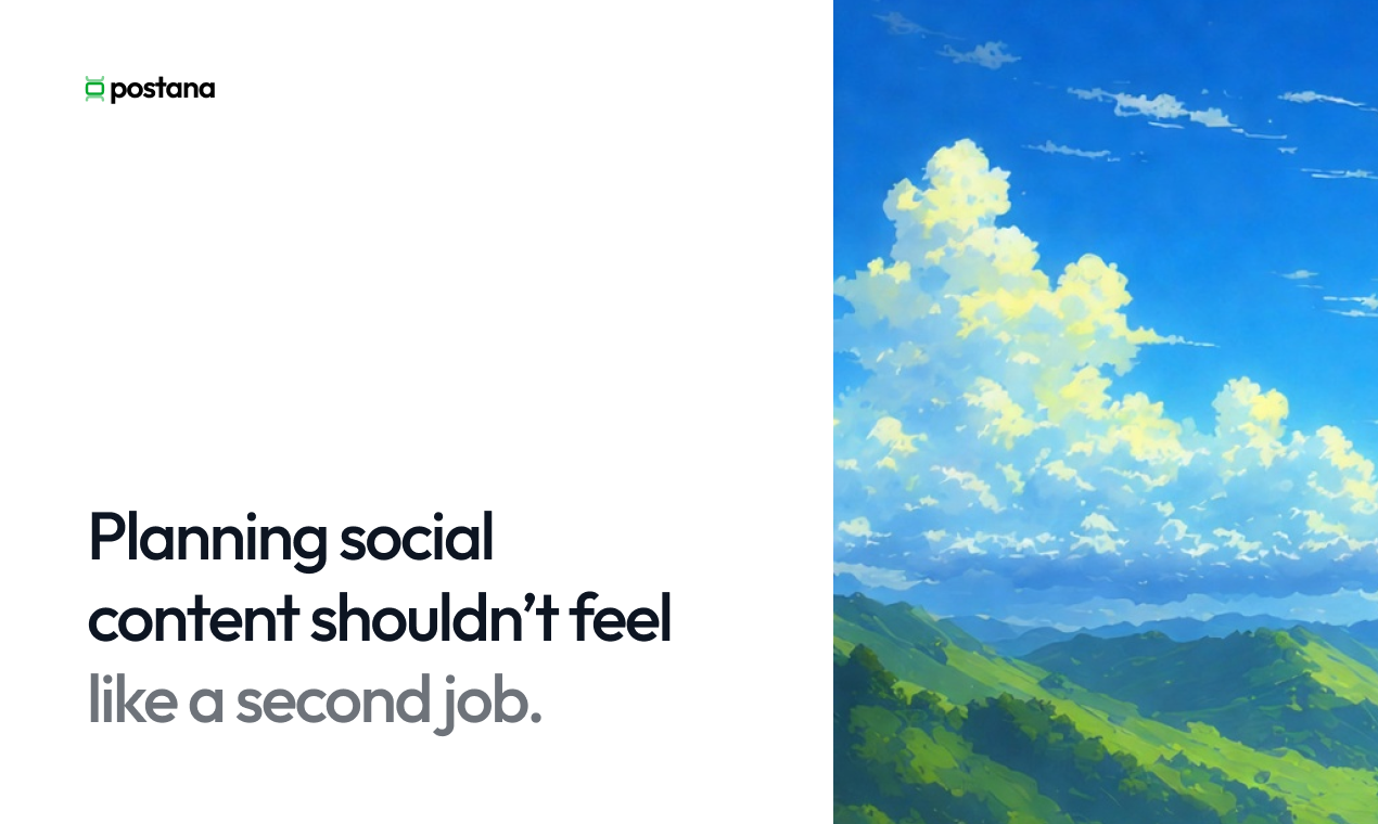 "Hey Product Hunt 👋 I built Postana after watching my partner spend 4+ hours every Sunday planning a single week of social media content. She had Notion open, ChatGPT in another tab, Canva loading, TikTok Studio for research, and a spreadsheet to track it all. It worked… but it felt chaotic and exhausting. That’s the real problem we kept seeing: creators and social media managers juggle way too many tools just to plan content. Research what’s trending, brainstorm ideas, write platform-specific scripts, design visuals, and organize a calendar; each step lives in a different app. Postana brings all of that into one flow. It helps you: ground ideas in what’s actually working on TikTok, Instagram, and LinkedIn turn those ideas into platform-native scripts and visuals organize everything into a clear content plan so you’re not starting from scratch every week The goal is simple: plan weeks of content in minutes, without the burnout. We’re excited to open this up to the PH community and would love feedback: what part of content planning feels the most painful for you right now? Happy to answer any questions 🙏"