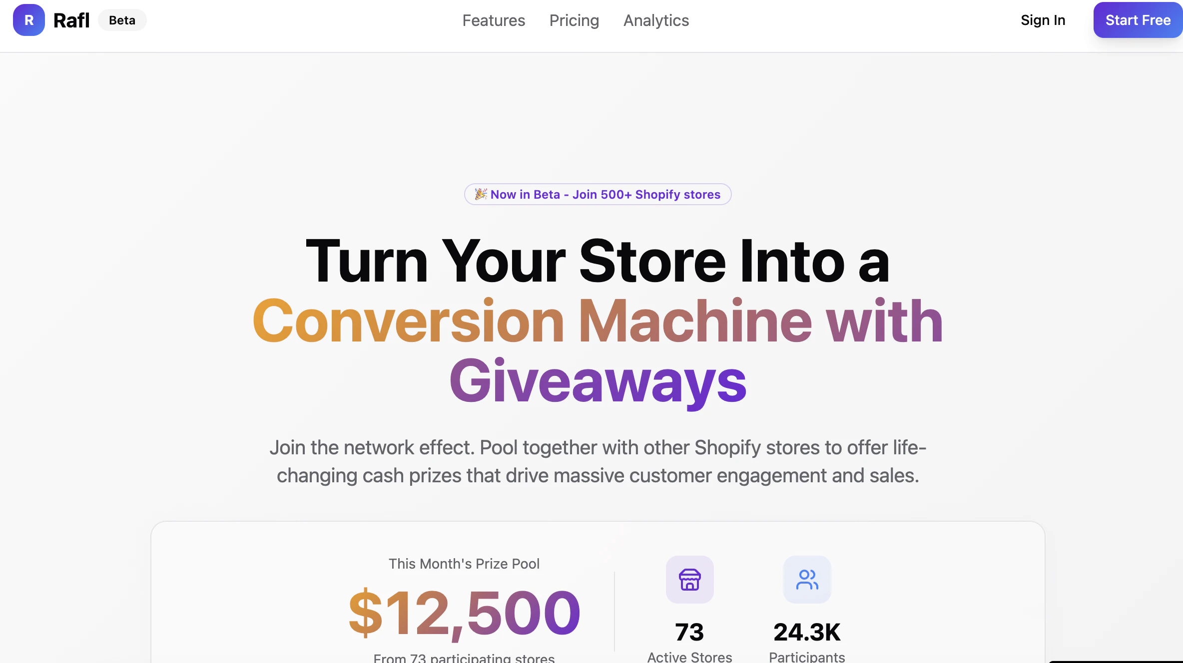 "Rafl.ai — Pooled Sweepstakes that Slash CAC for Shopify Rafl.ai turns ordinary giveaways into cross-store growth machines. Instead of each brand offering a small prize that fizzles, Rafl lets multiple Shopify stores pool into one Big Pooled Prize—driving dramatically higher conversion on email capture, purchases, and ad traffic. Bigger prize → more buzz → more entrants → lower CAC. Why it matters Bigger prize, bigger lift: The pooled prize meaningfully boosts opt-in rates on popups/landing pages and nudges more “window-shoppers” into buyers. Lower CAC, higher ROAS: Co-funded prizes + shared distribution = cheaper clicks and more efficient acquisition. PR & social tailwind: As the prize grows, so does media and creator interest—your campaign becomes a story worth covering. No headaches: Guardrails, templates, and best-practice defaults mean no legal or compliance headaches to worry about. Fast setup: Go from idea to live campaign in as little as 5 minutes. What you can do with Rafl.ai Join a Big Pooled Prize to amplify reach with like-minded brands. Capture zero-party data (emails + customers) you actually own. Boost purchases with smart entry mechanics and on-site prompts. Run paid ads confidently to a high-converting prize that stretches your budget further. Anti-fraud & moderation keep entries clean and credible. Clean analytics tie entrants and revenue back to the campaign so you can prove lift and dial in CAC. How it works Connect your Shopify store Pick the free or paid tier pooled prize option Publish the Giveaway message on your existing on-site popup Promote via email, social, paid, influencers, and co-marketing partners Track performance (entrants, purchases, CAC, revenue) in the dashboard Who it’s for DTC brands, creators, and sellers on Shopify (to start) who want acquisition that scales without torching ad dollars. We’d love your feedback. If you’re a Shopify brand looking to grow your list and sales with Proven recurring monthly, high-impact Giveaways, try Rafl.ai and tell us what you want to see next."