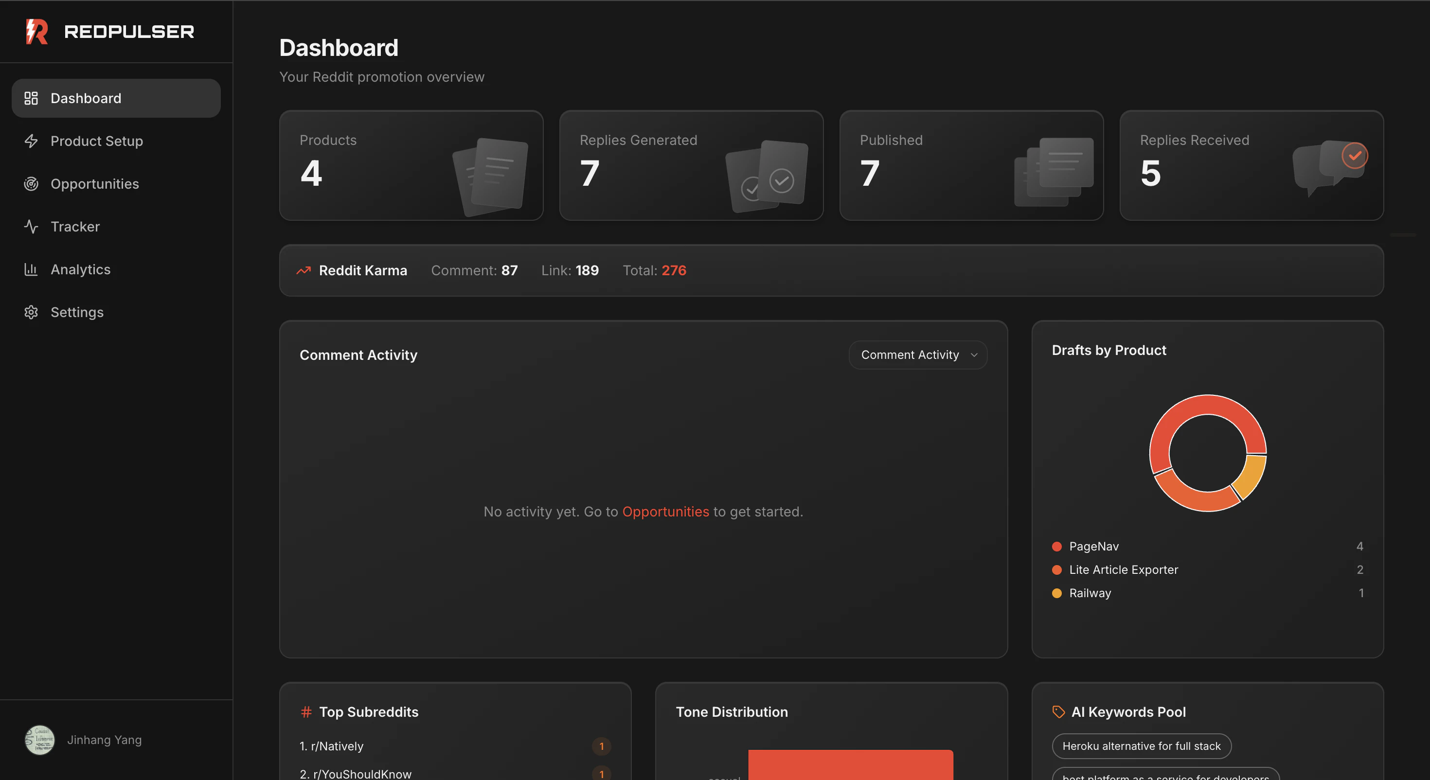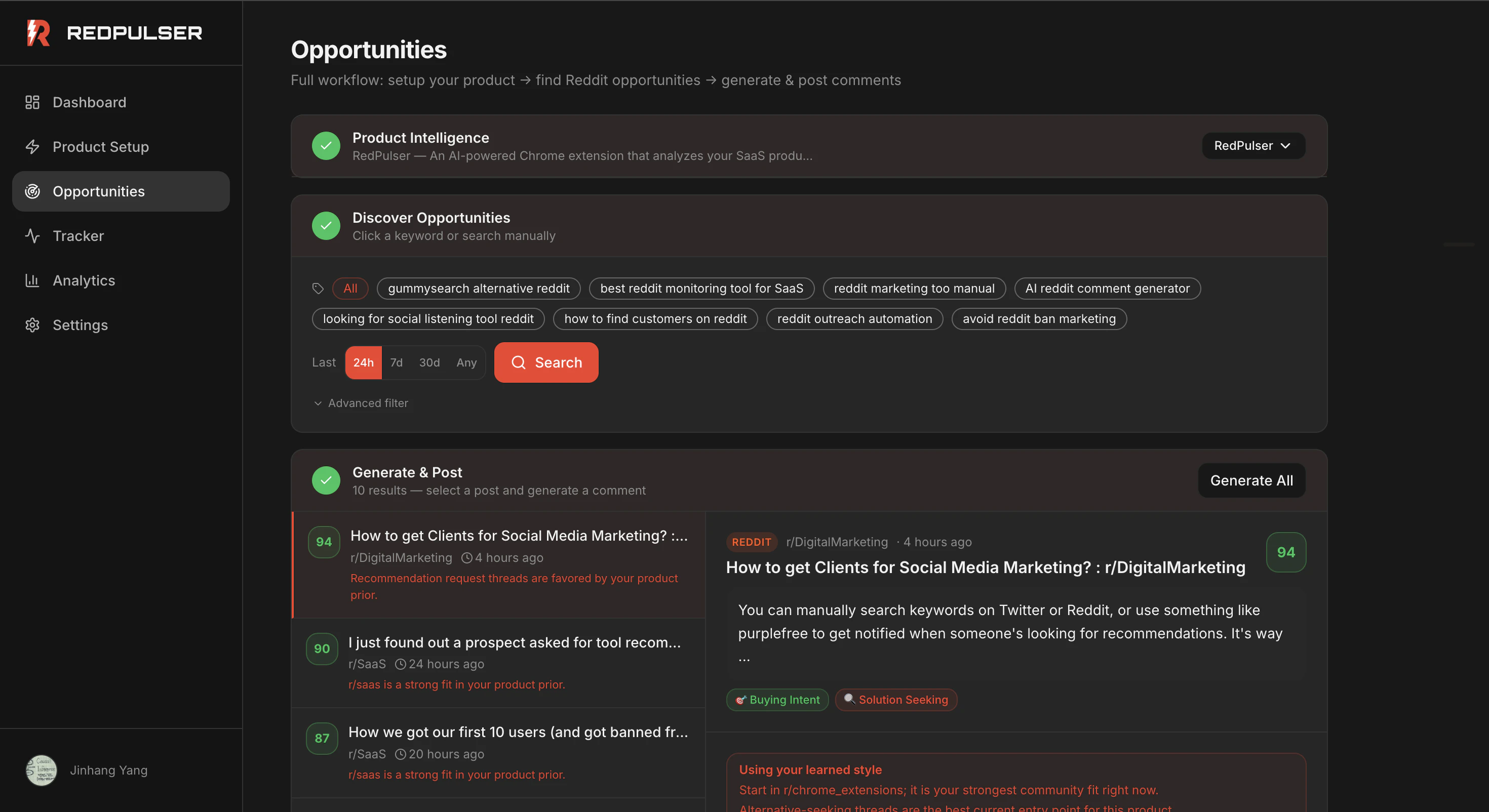 RedPulser helps indie hackers and SaaS teams turn Reddit into a repeatable acquisition channel. Paste your product URL, discover high-fit threads, draft context-aware replies, track outcomes, and improve with every comment.