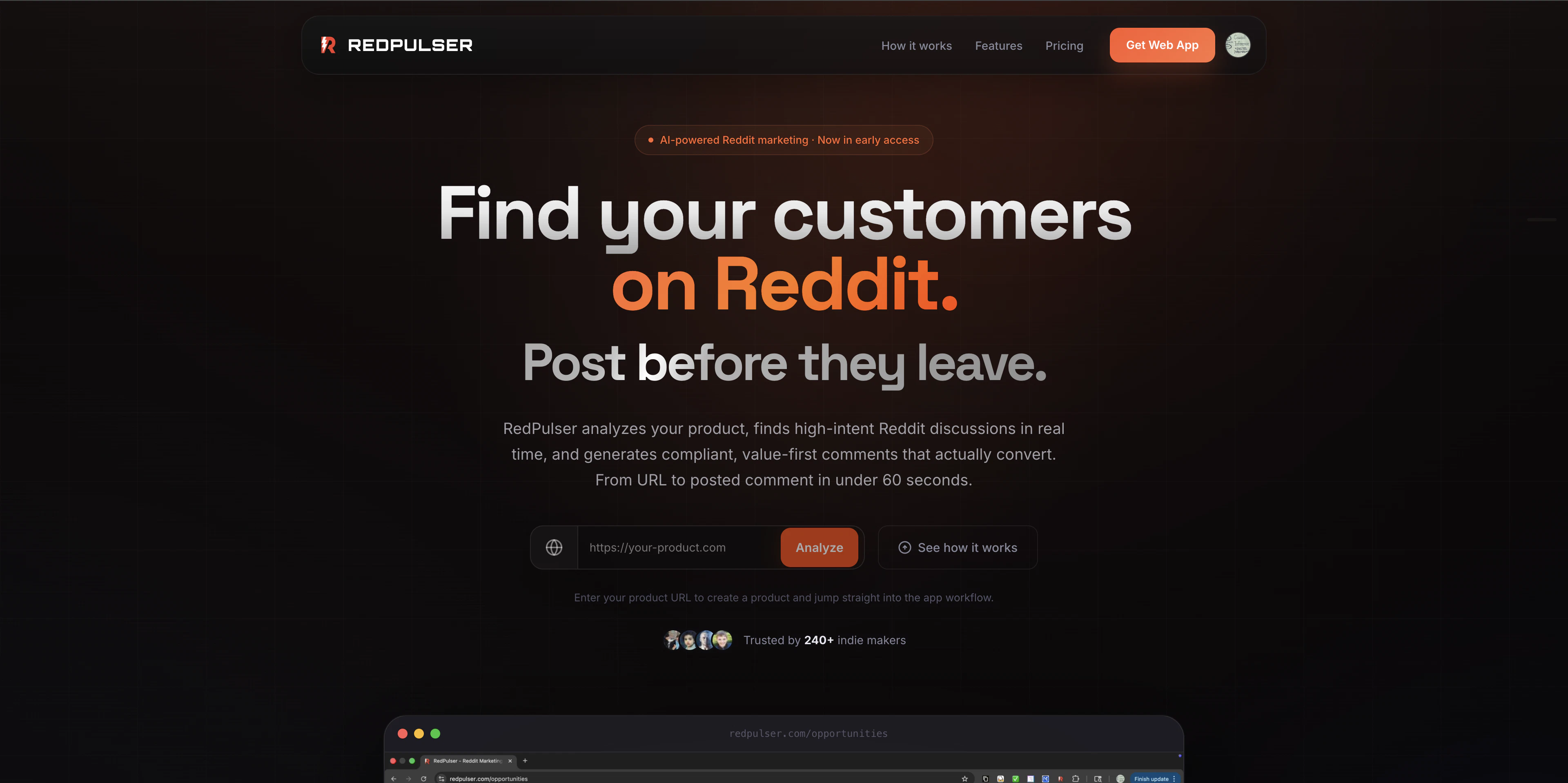 "Hey Product Hunt! I’m the maker of RedPulser. I built this because Reddit outreach felt way too manual. Finding the right threads, writing replies that fit, and then learning what actually worked all felt disconnected. RedPulser is my attempt to turn that into a repeatable workflow. You paste in a product URL, it figures out what the product does, finds relevant Reddit discussions, ranks the best opportunities, helps draft context-aware replies, and tracks outcomes after posting so future suggestions keep improving. The goal isn’t just to help people “find posts” or “write comments.” It’s to make Reddit outreach feel systematic instead of scattered. Would love to hear how you approach Reddit today and what part of the workflow feels hardest for you."