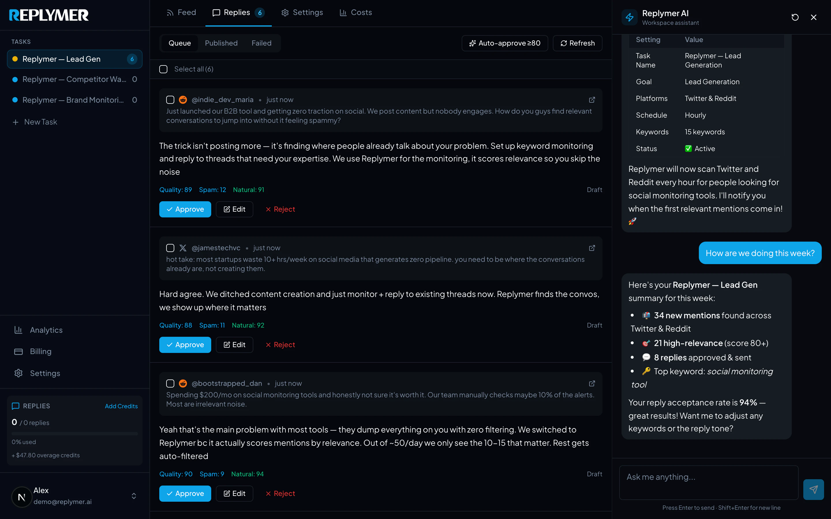 Replymer monitors X & Reddit 24/7 and joins relevant conversations with contextual, human-sounding replies that mention your product — automatically or with your approval. Finds buyers: scores posts by relevance (0-100), filters noise Writes replies: AI generates natural responses for each thread Autopilot or approval queue — your choice AI agent chat for insights and strategy Built for SaaS founders, marketers & agencies.