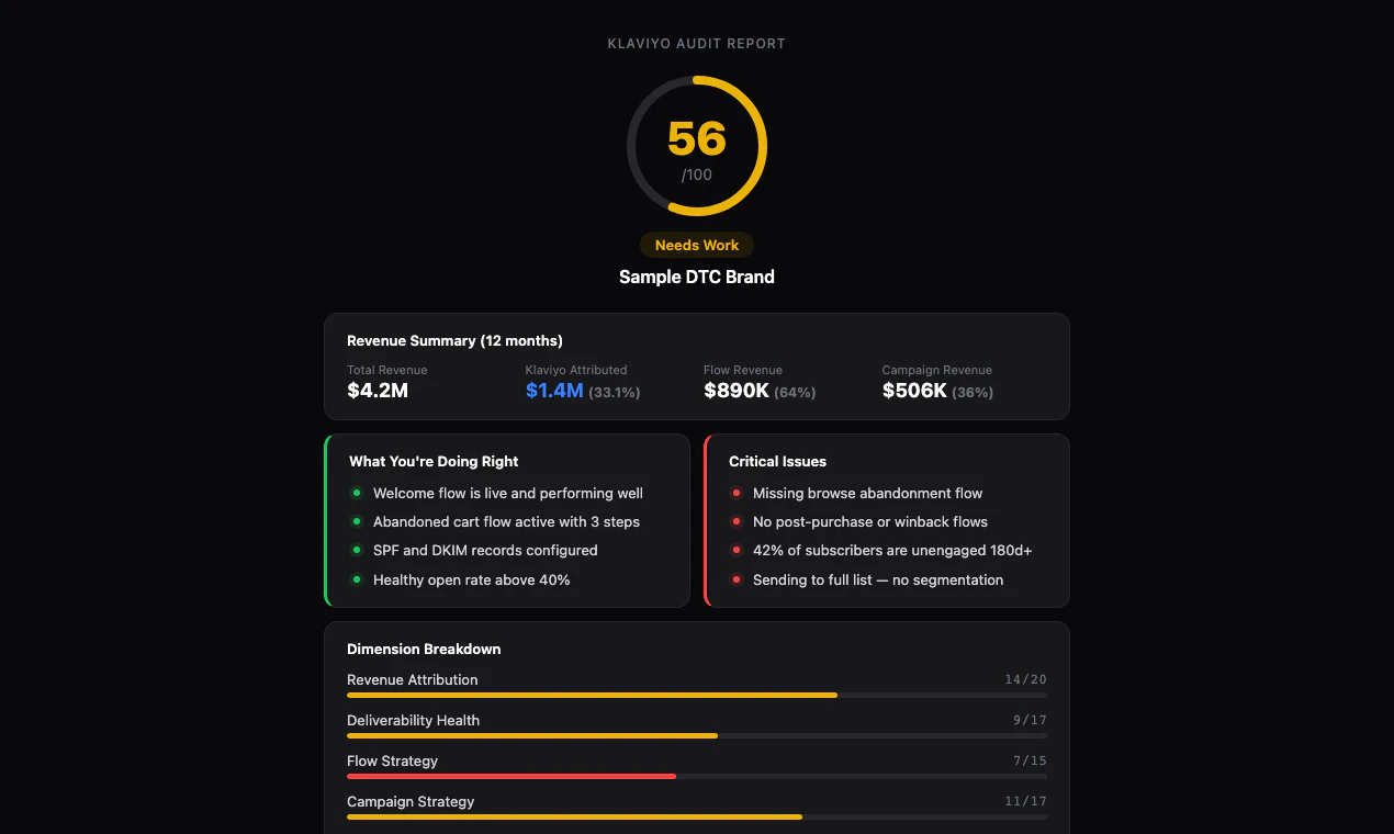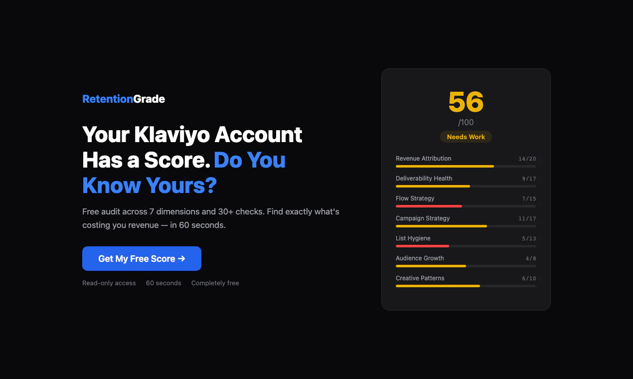 RetentionGrade scans your entire Klaviyo setup across 7 dimensions and 30+ checks — revenue attribution, deliverability, flows, campaigns, list hygiene, audience growth, and creative patterns. You get a score out of 100 with prioritized findings and exactly what to fix first. Most brands score between 40-65 and discover critical issues they didn't know existed. Free, read-only, takes 60 seconds. Built by the Klaviyo experts at Sweat Pants Agency.
