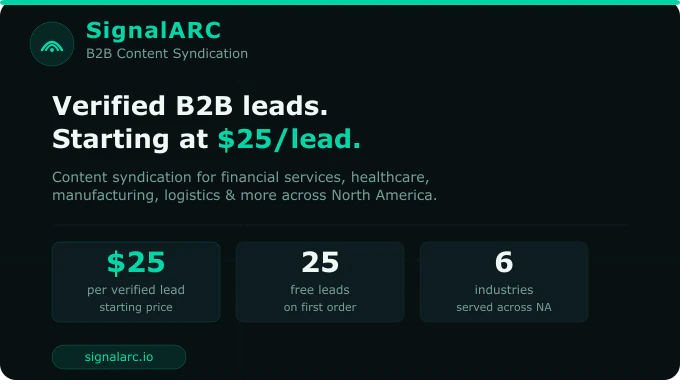 SignalARC is a B2B content syndication agency serving North America. We distribute client content to verified decision-makers in financial services, healthcare, manufacturing, logistics, HR, and commercial real estate — delivering leads starting at $25 per verified contact with 25 free leads on every first order.