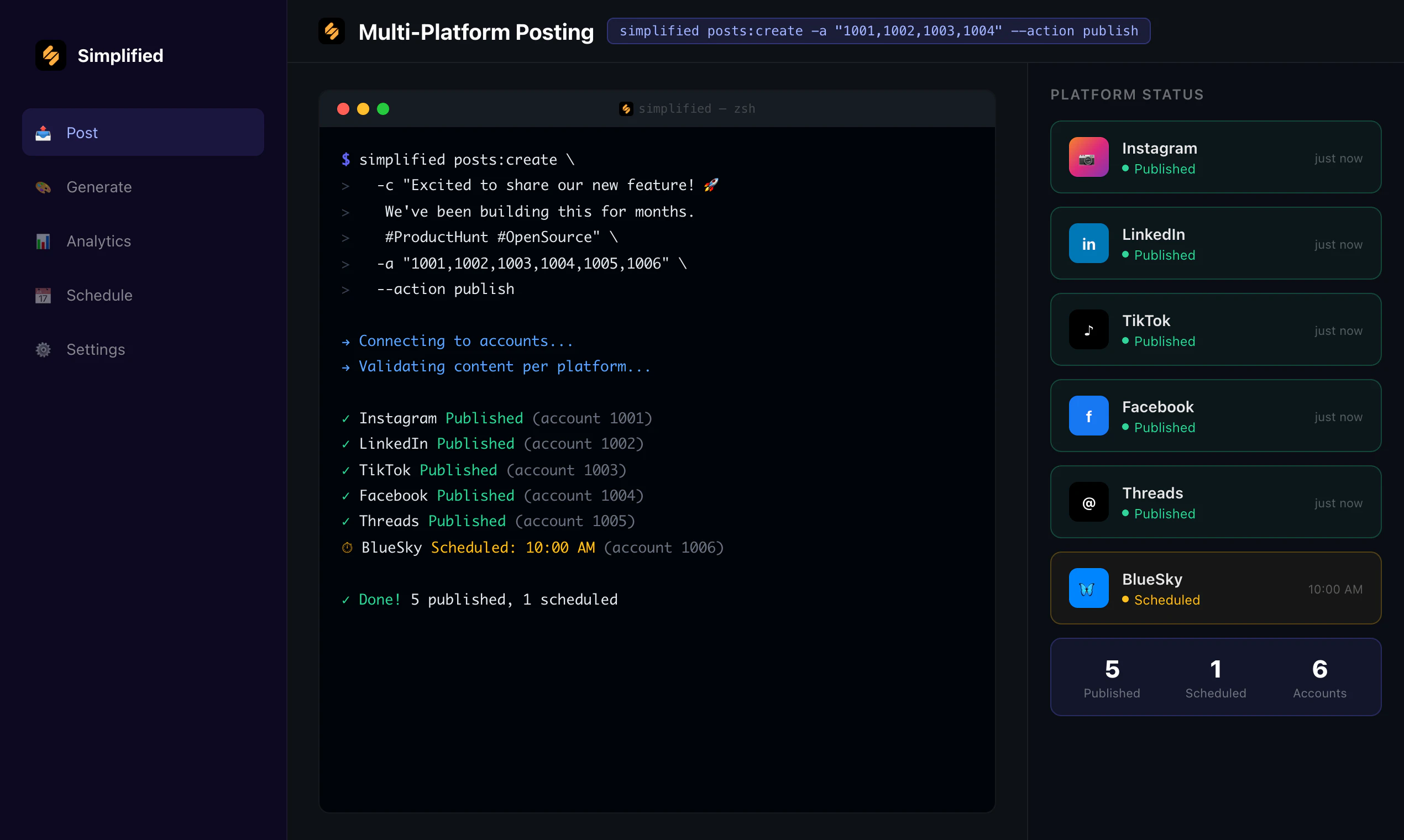 "Hey Product Hunt!We built Simplified CLI because we believe social media management shouldn't require switching between 10 browser tabs and 5 different dashboards.As developers at Simplified.com, we saw a gap: marketing teams had great GUI tools, but developers and AI agents had nothing native for the terminal. So we built it.With Simplified CLI, you can:- Publish to 10 platforms in one command- Generate AI images with 20+ models (Flux, DALL-E, Stability...)- Pipe JSON output into AI agents and automation workflows- Track analytics, schedule posts, manage drafts - all from the terminalFull docs: https://simplified.readme.io/ref...It's open source (MIT), installs in seconds via npm, and works beautifully as a Claude Code plugin for AI-powered social media management.Would love to hear your feedback - what platforms or features matter most to you?"