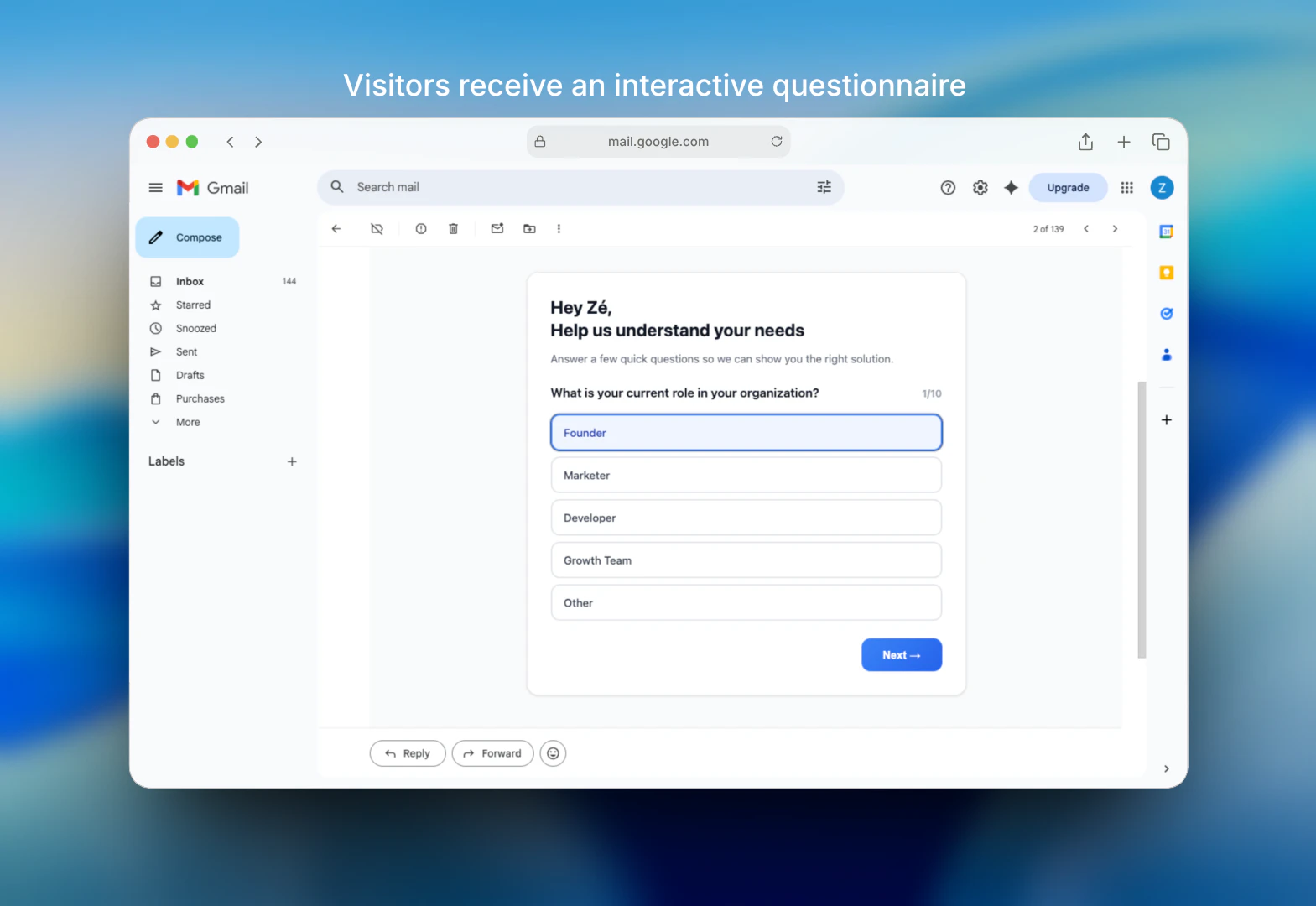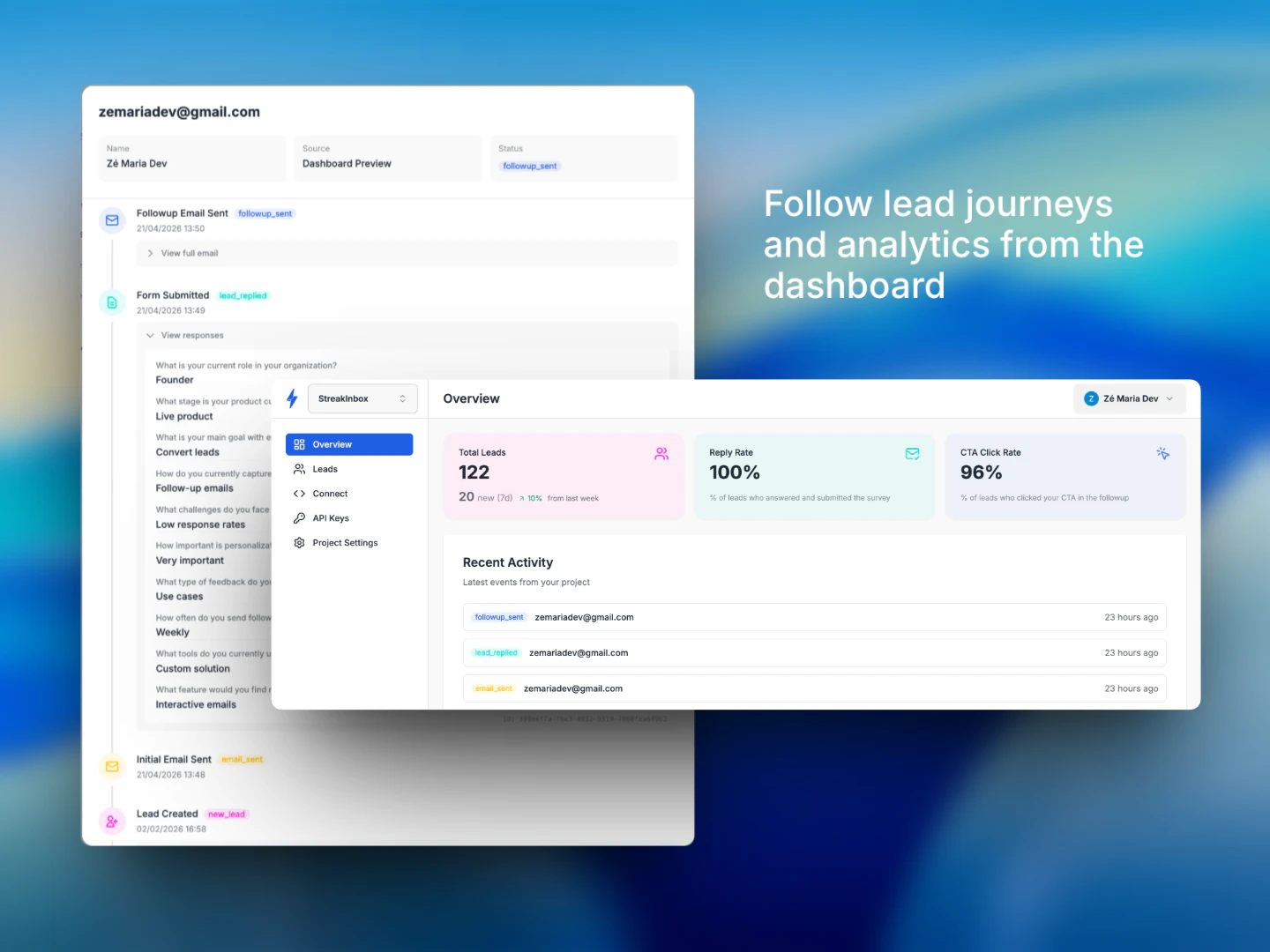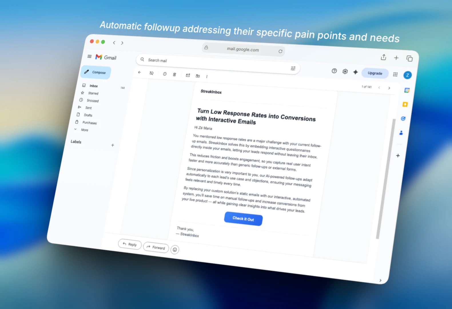 StreakInbox helps founders and teams understand user intent and increase conversions through interactive emails. Instead of static forms and generic follow-ups, it enables teams to ask the right questions directly inside the inbox. Responses are captured instantly and used to trigger personalized, context-aware follow-ups that address each user’s pain points, needs, objections or motivations, resulting in less friction, higher engagement, and better-qualified leads before or after launch.