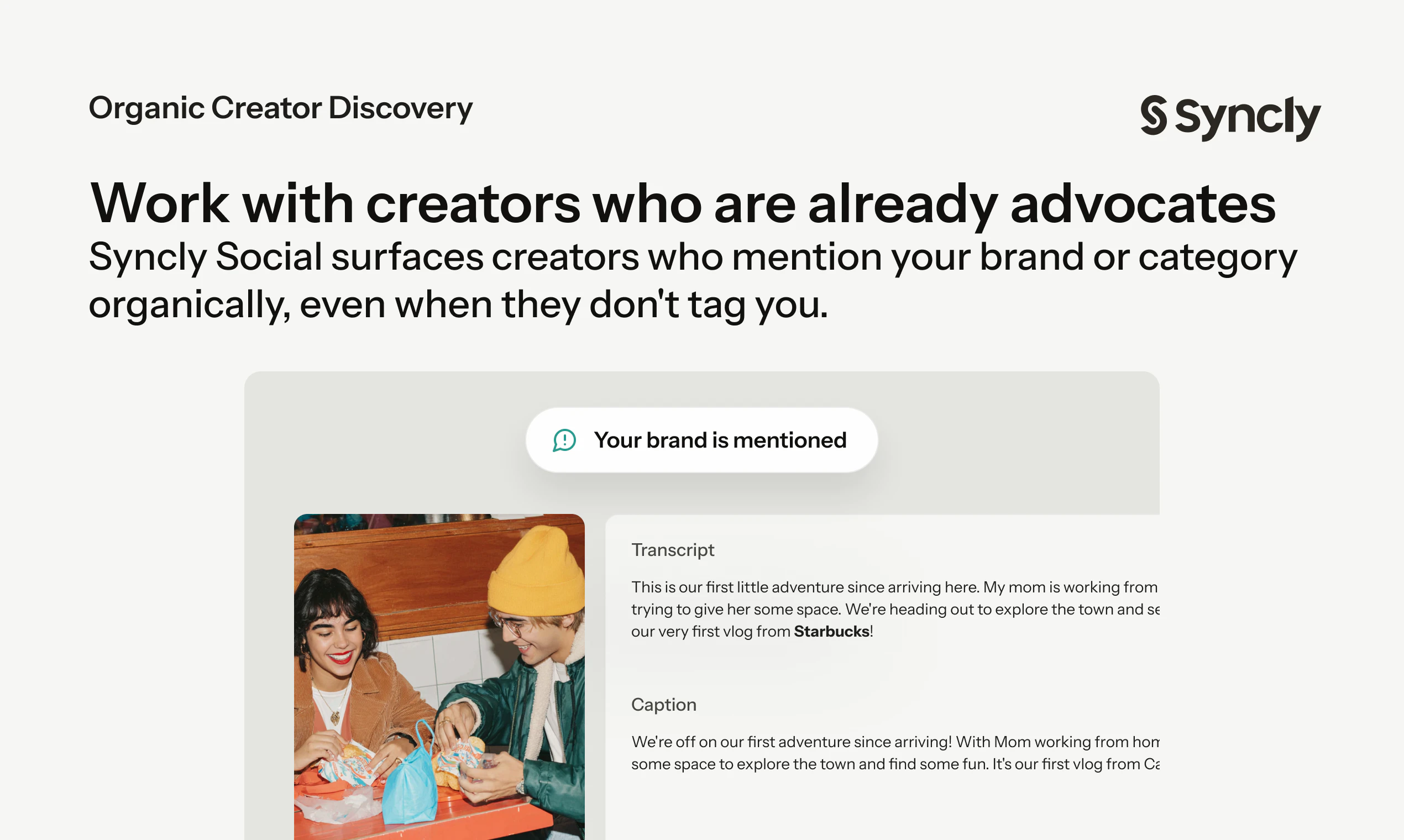 "Hey Product Hunt! I'm Joseph, co-founder of Syncly. We've been working on AI-powered social listening, and today we're excited to launch Creator Discovery.The problem we kept hearing from brands and agencies: finding the right influencer still means scrolling through endless profiles, guessing from follower counts, and manually watching content to check if someone's actually a good fit.What we built: describe your ideal creator in plain English, and Syncly searches inside the actual video content to find them. Visual aesthetic, spoken brand mentions, storytelling style, content format - all searchable without a single filter dropdown.A few things that make this different:Content-first, not profile-first. We analyze what creators show, say, and feel in their videos - not just their bio and follower count.Natural language search. Type "clean minimal apartment, morning skincare routine, conversational tone" and get results. No complex filter setup needed.Find real advocates. Syncly detects organic brand mentions from actual speech in videos - no hashtag or tag required. Find people who already love your brand without knowing it.We'd love for you to try it and share feedback - what search would you run first for your brand?Free trialDemo"