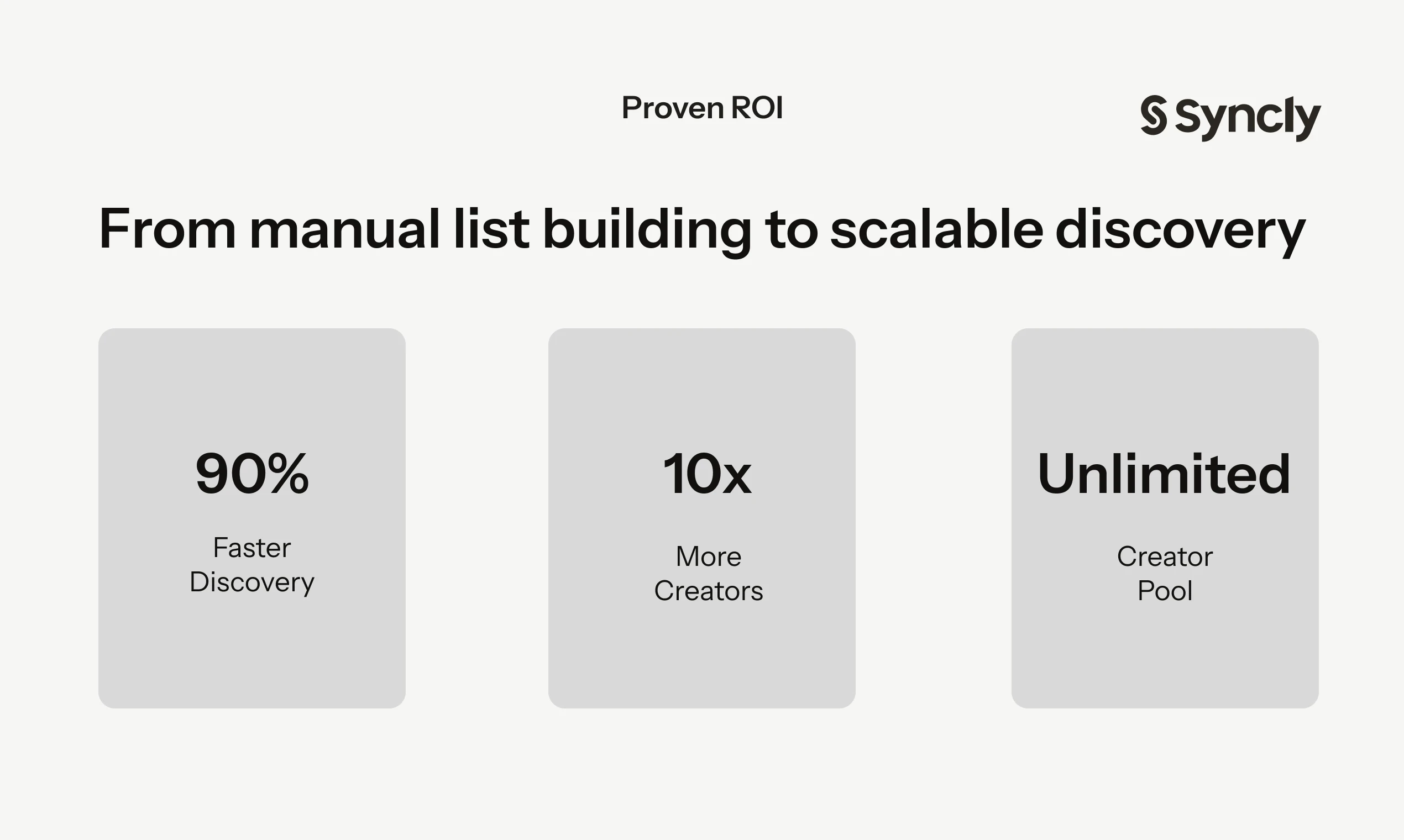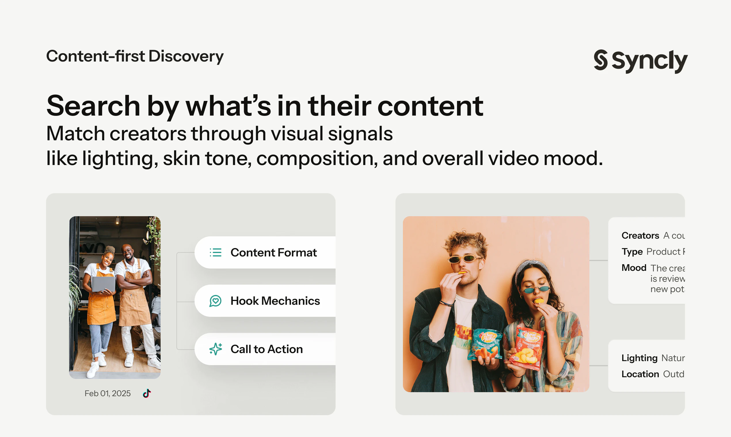 Syncly Social lets you find creators by what's actually in their videos, not just profile metrics. Describe your ideal creator in plain English ("clean minimal aesthetic, morning routine content, mentions skincare brands organically") and our AI searches inside video content to find matches. Unlike traditional tools that filter by follower count and categories, Syncly analyzes visuals, speech, tone, and brand mentions across every frame.