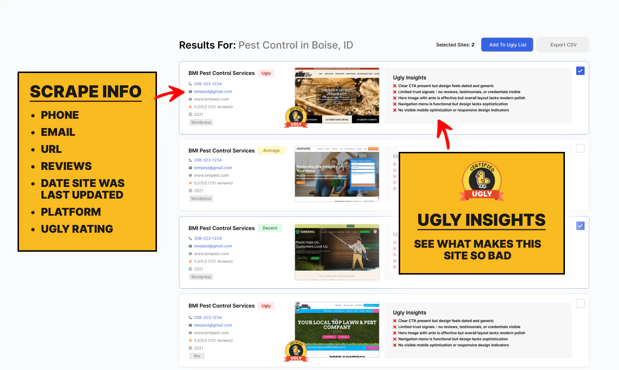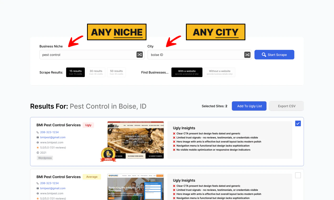 Search any niche and city to find local businesses with outdated websites, their contact info, and AI-powered ugly insights.