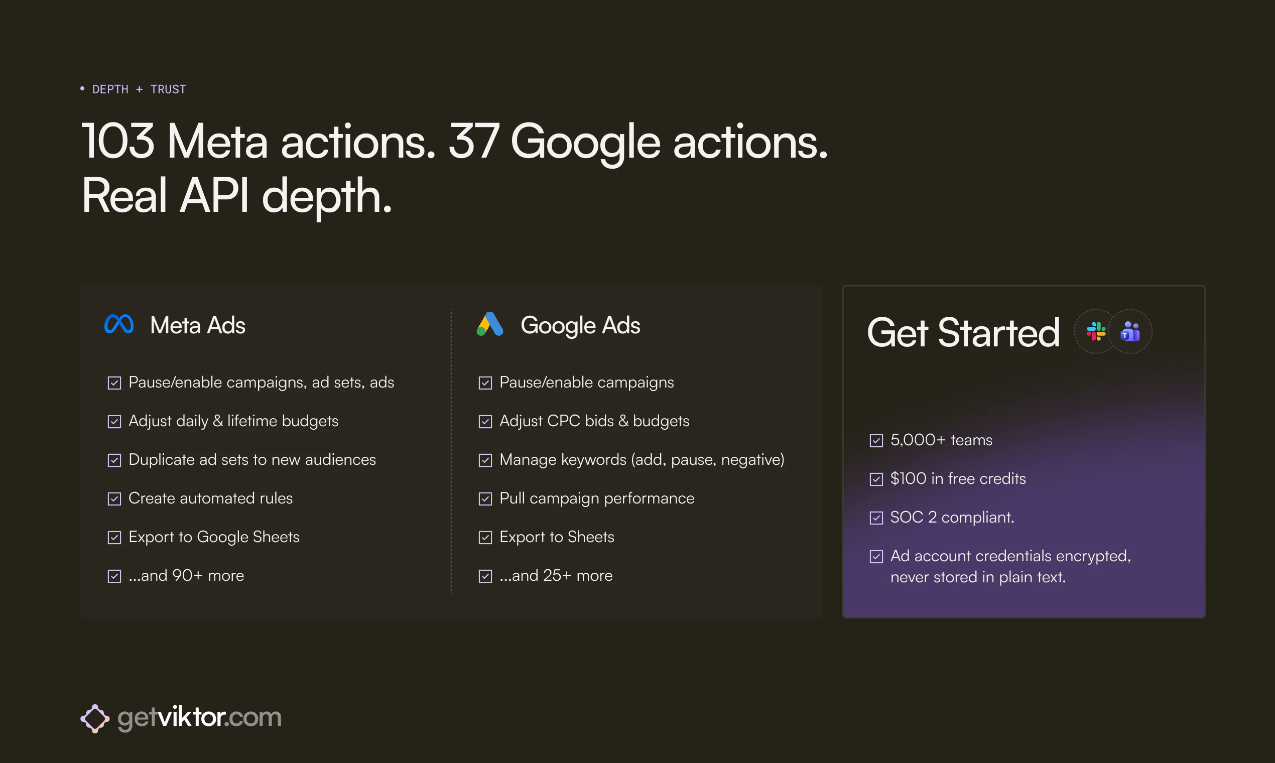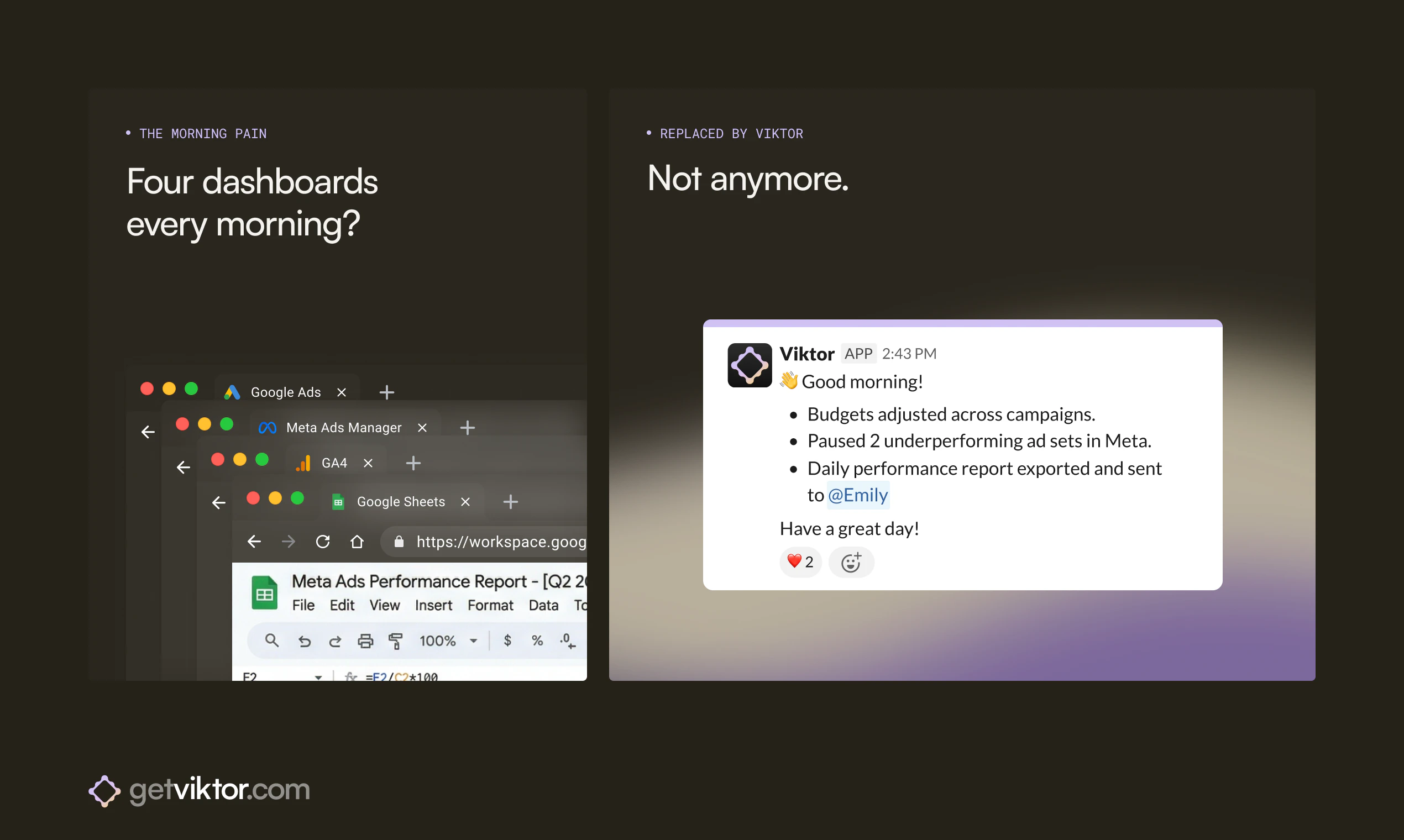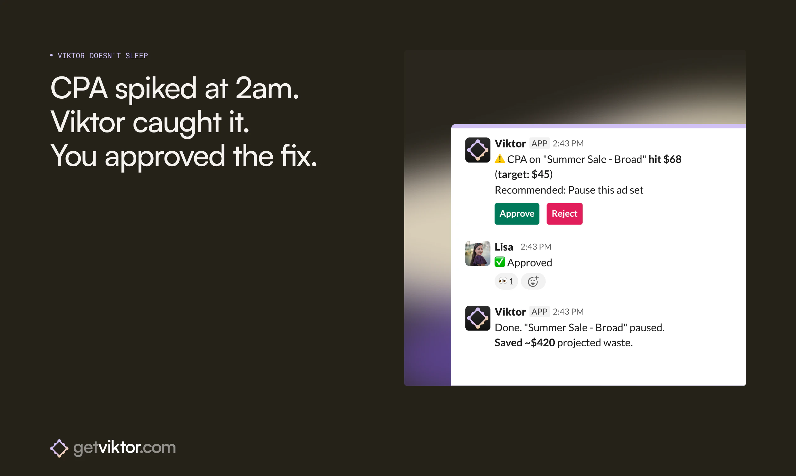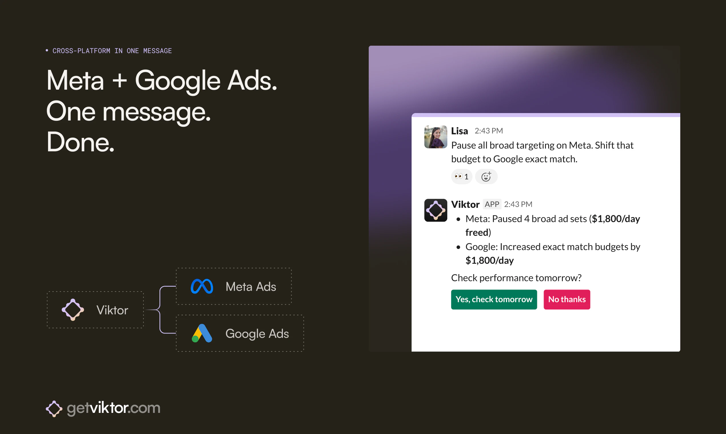 "Hey everyone, Fryd here. Co-founder of Viktor.We launched Viktor on Product Hunt a few weeks ago and hit #4 for the day. Since then, something interesting happened: media buyers started showing up. A lot of them.Turns out, when you build an AI agent that connects to Meta Ads and Google Ads with real write access, performance marketers find you. They don't care that Viktor can also manage your GitHub repos or build Slack apps. They care that it can pause a $68 CPA ad set at 2am while they're asleep.So we built a vertical experience around it.What Viktor actually does for media buying:-> Connects to your Meta Ads and Google Ads accounts via OAuth (two minutes, no API keys)-> Pauses underperformers, scales winners, adjusts budgets from a single Slack message-> Shifts budget cross-platform: "Cut Meta by 30%, move it to Google exact match." Done.-> Cross-references Meta's reported revenue against your actual Stripe charges (Meta over-reports by 20-40% for most of our users, mostly view-through attribution)-> Exports weekly performance reports to Google Sheets-> Runs overnight: if CPA spikes at 3am, Viktor pauses the ad set and tells you about it in the morningThe depth matters. Viktor has 103 available actions on Meta Ads and 37 on Google Ads. That's not "we can pull your campaign stats." That's pause, enable, adjust budgets, duplicate ad sets to new audiences, manage keywords, change bids, create automated rules, and export everything to Sheets.What we're honest about: Ad copy changes on Google Ads (responsive search ads) still happen in the Google Ads UI. Viktor handles campaign structure, budgets, bids, targeting, keywords, and reporting. Not creative. We'd rather tell you upfront than have you find out on day two.How to try Viktor:1. Add Viktor to Slack (one click from the Slack App Directory)2. Connect your Meta and/or Google Ads accounts3. Ask Viktor to audit your last 7 daysYou get $100 in free credits. No credit card. That's enough to run Viktor for weeks on typical media buying workflows. Most people see the value in the first audit.We built this because we run ads ourselves and got tired of the morning ritual: open Meta Ads Manager, open Google Ads, open GA4, open Sheets, pull numbers, compare, decide, act. Viktor does that loop in 30 seconds from one Slack message.If you run ads across Meta and Google, I'd genuinely like to hear what your workflow looks like. We're building the vertical pages and integrations based on what actual media buyers tell us they need.getviktor.com/for/media-buying"